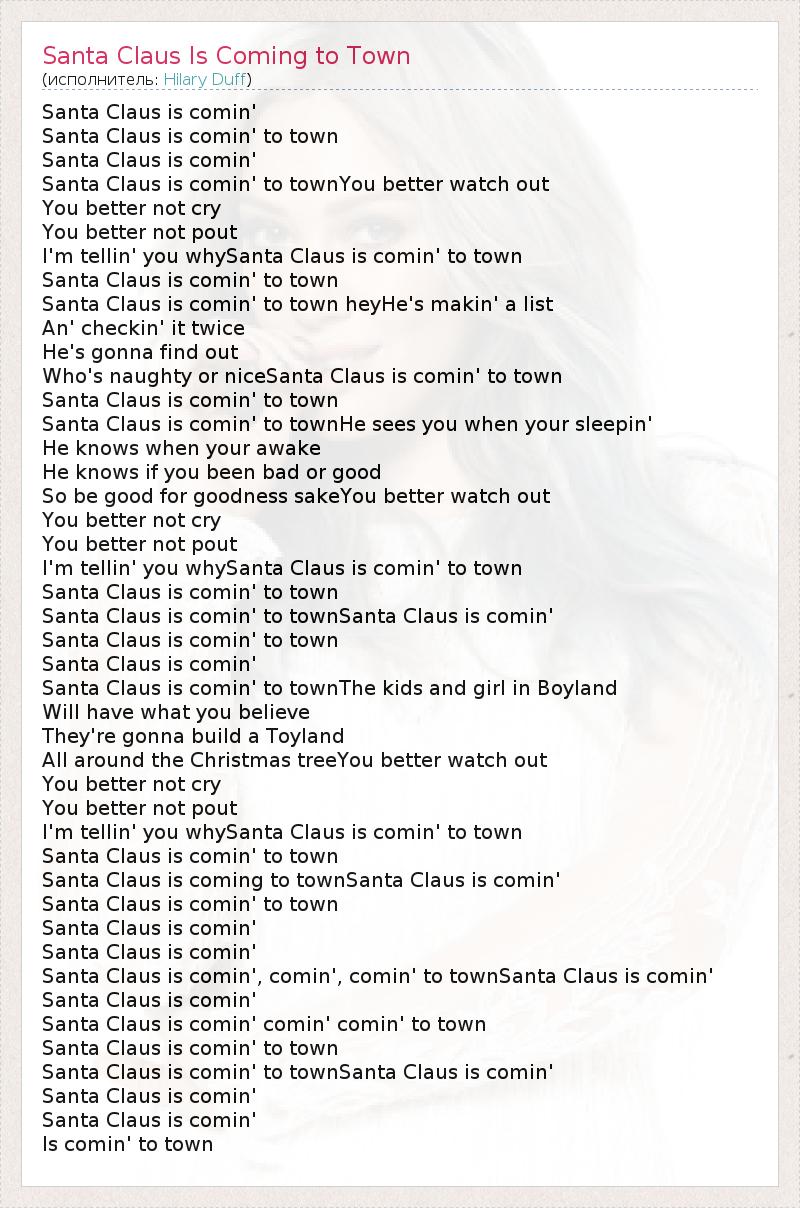 Santa Claus is comin' Santa Claus is comin' to town Santa Claus is comin' Santa Claus is comin' to townYou better watch out You better not cry You better not pout I'm tellin' you whySanta Claus is comin' to town Santa Claus is comin' to town Santa Claus is comin' to town heyHe's makin' a list An' checkin' it twice He's gonna find out Who's naughty or niceSanta Claus is comin' to town Santa Claus is comin' to town Santa Claus is comin' to townHe sees you when your sleepin' He knows when your awake He knows if you been bad or good So be good for goodness sakeYou better watch out You better not cry You better not pout I'm tellin' you whySanta Claus is comin' to town Santa Claus is comin' to town Santa Claus is comin' to townSanta Claus is comin' Santa Claus is comin' to town Santa Claus is comin' Santa Claus is comin' to townThe kids and girl in Boyland Will have what you believe They're gonna build a Toyland All around the Christmas treeYou better watch out You better not cry You better not pout I'm tellin' you whySanta Claus is comin' to town Santa Claus is comin' to town Santa Claus is coming to townSanta Claus is comin' Santa Claus is comin' to town Santa Claus is comin' Santa Claus is comin' Santa Claus is comin', comin', comin' to townSanta Claus is comin' Santa Claus is comin' Santa Claus is comin' comin' comin' to town Santa Claus is comin' to town Santa Claus is comin' to townSanta Claus is comin' Santa Claus is comin' Santa Claus is comin' Is comin' to town