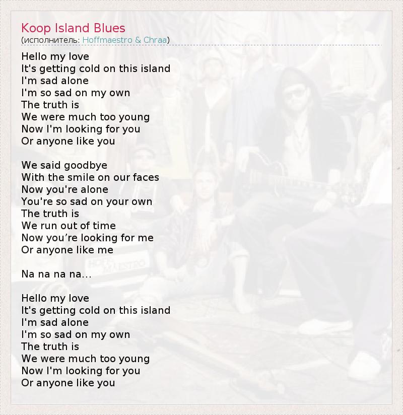 Здравствуй, моя любовь... Становится холоднее на этом острове. Мне печально: я одна, Я так печальна в своём одиночестве. Правда в том, Что мы были слишком молоды, А теперь мне необходим ты Или кто-нибудь, похожий на тебя. Мы попрощались С улыбками на лицах... Теперь ты один. Ты так печален в своём одиночестве. Правда в том, Что наше время прошло. А теперь тебе необходима я Или кто-нибудь, похожий на меня. На на на на... Здравствуй, моя любовь... Становится холоднее на этом острове. Мне печально: я одна, Я так печальна в своём одиночестве. Правда в том, Что мы были слишком молоды, А теперь мне необходим ты Или кто-нибудь, похожий на тебя.