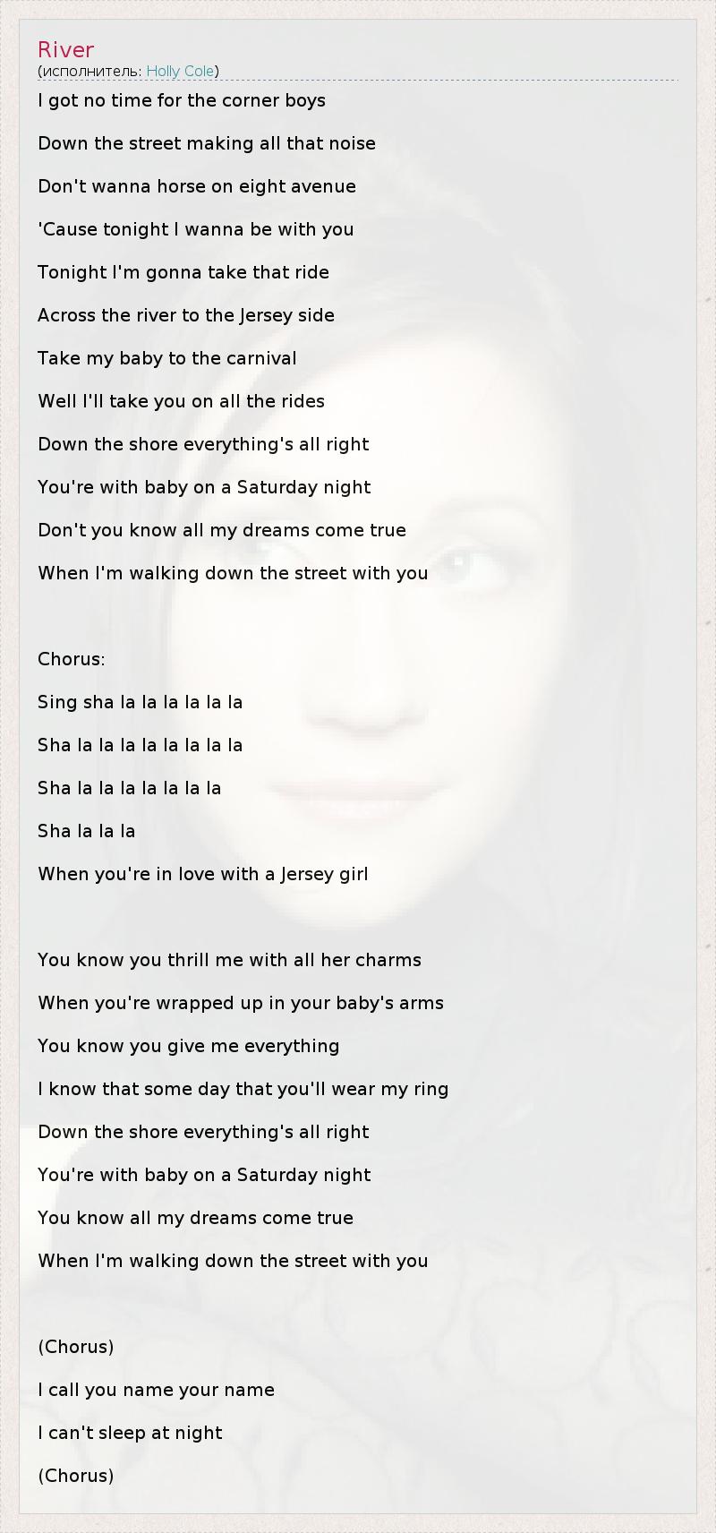 I got no time for the corner boys Down the street making all that noise Don't wanna horse on eight avenue 'Cause tonight I wanna be with you Tonight I'm gonna take that ride Across the river to the Jersey side Take my baby to the carnival Well I'll take you on all the rides Down the shore everything's all right You're with baby on a Saturday night Don't you know all my dreams come true When I'm walking down the street with you Chorus: Sing sha la la la la la la Sha la la la la la la la la Sha la la la la la la la Sha la la la When you're in love with a Jersey girl You know you thrill me with all her charms When you're wrapped up in your baby's arms You know you give me everything I know that some day that you'll wear my ring Down the shore everything's all right You're with baby on a Saturday night You know all my dreams come true When I'm walking down the street with you (Chorus) I call you name your name I can't sleep at night (Chorus)