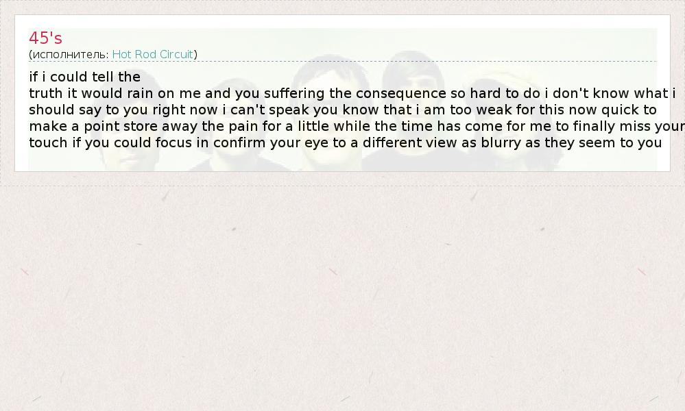 Это интересно:Американская indie emo / alternative rock группа, основанная в 1997 году в городе Нью-Хейвен, штат Коннектикут. Изначально назывались "Antidote" и под этим названием выпустили EP "Mr. Glenboski" в 1998 году. В 1999 году записывается EP "Hot Rod Circuit" и первый альбом - "If I Knew Now What I Knew Then", в это же время группа меняет название на "Hot Rod Circuit".... продолжение