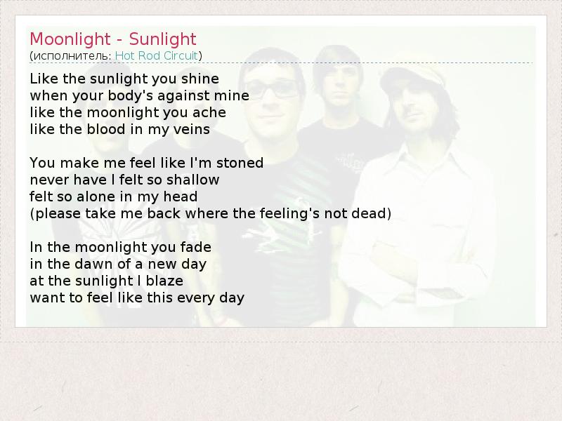 Как солнце светит вам когда ваш организм от шахты как лунный свет вы болеть как кровь в моих жилах Ты заставляешь меня чувствовать, как будто я под кайфом я никогда не чувствовал себя настолько мелкая чувствовал себя таким одиноким в моей голове (пожалуйста, возьми меня туда, где чувства не умер) В лунном свете вы исчезать На рассвете нового дня в солнечном свете Я прокладывать хотите чувствовать это каждый день