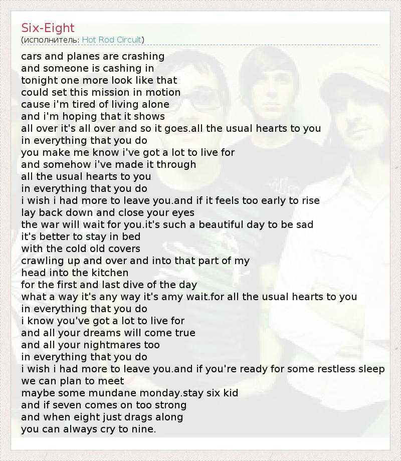 cars and planes are crashing and someone is cashing in tonight one more look like that could set this mission in motion cause i'm tired of living alone and i'm hoping that it shows all over it's all over and so it goes.all the usual hearts to you in everything that you do you make me know i've got a lot to live for and somehow i've made it through all the usual hearts to you in everything that you do i wish i had more to leave you.and if it feels too early to rise lay back down and close your eyes the war will wait for you.it's such a beautiful day to be sad it's better to stay in bed with the cold old covers crawling up and over and into that part of my head into the kitchen for the first and last dive of the day what a way it's any way it's amy wait.for all the usual hearts to you in everything that you do i know you've got a lot to live for and all your dreams will come true and all your nightmares too in everything that you do i wish i had more to leave you.and if you're ready for some restless sleep we can plan to meet maybe some mundane monday.stay six kid and if seven comes on too strong and when eight just drags along you can always cry to nine.