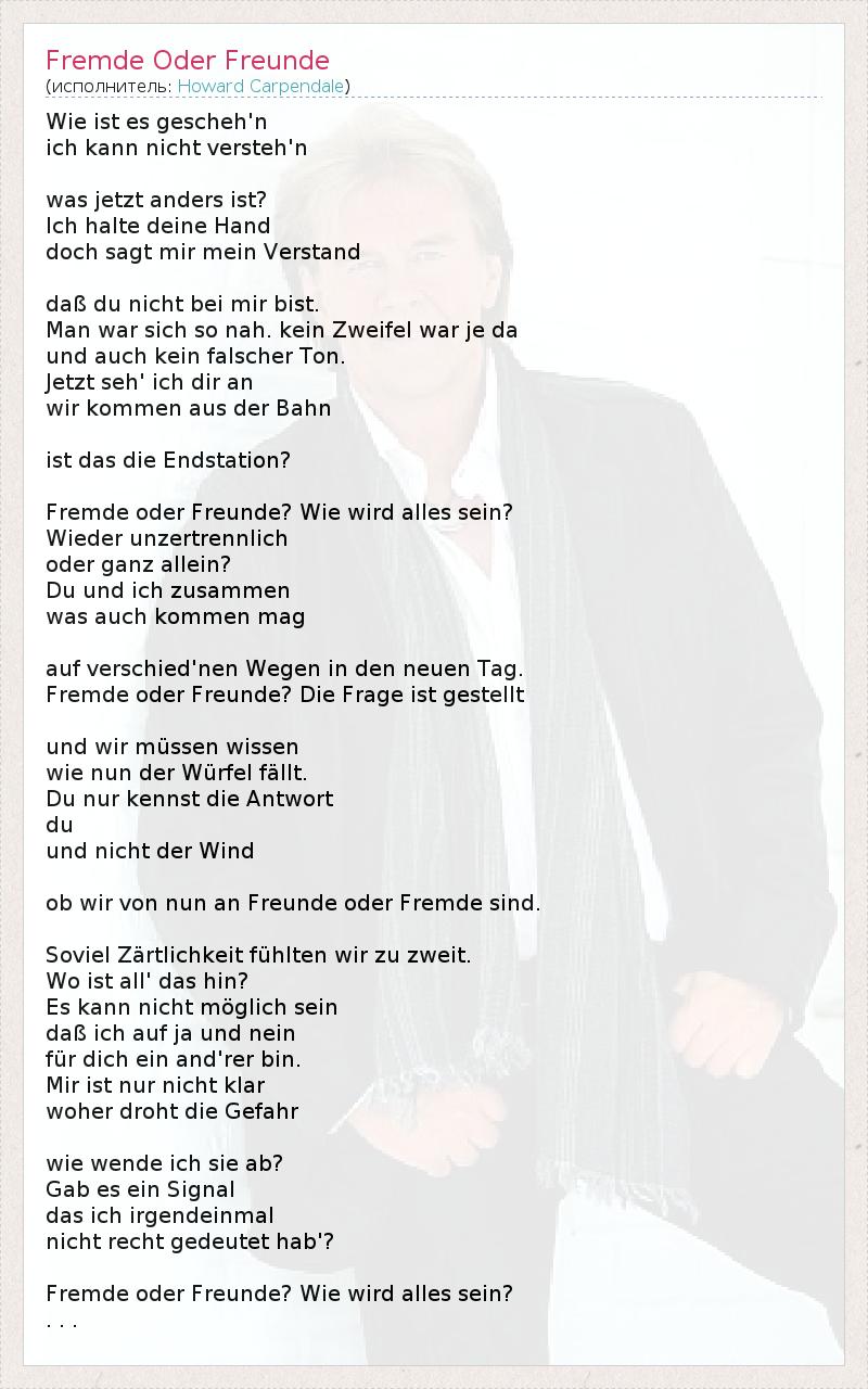 Wie ist es gescheh'n ich kann nicht versteh'n was jetzt anders ist? Ich halte deine Hand doch sagt mir mein Verstand daß du nicht bei mir bist. Man war sich so nah. kein Zweifel war je da und auch kein falscher Ton. Jetzt seh' ich dir an wir kommen aus der Bahn ist das die Endstation? Fremde oder Freunde? Wie wird alles sein? Wieder unzertrennlich oder ganz allein? Du und ich zusammen was auch kommen mag auf verschied'nen Wegen in den neuen Tag. Fremde oder Freunde? Die Frage ist gestellt und wir müssen wissen wie nun der Würfel fällt. Du nur kennst die Antwort du und nicht der Wind ob wir von nun an Freunde oder Fremde sind. Soviel Zärtlichkeit fühlten wir zu zweit. Wo ist all' das hin? Es kann nicht möglich sein daß ich auf ja und nein für dich ein and'rer bin. Mir ist nur nicht klar woher droht die Gefahr wie wende ich sie ab? Gab es ein Signal das ich irgendeinmal nicht recht gedeutet hab'? Fremde oder Freunde? Wie wird alles sein? . . .