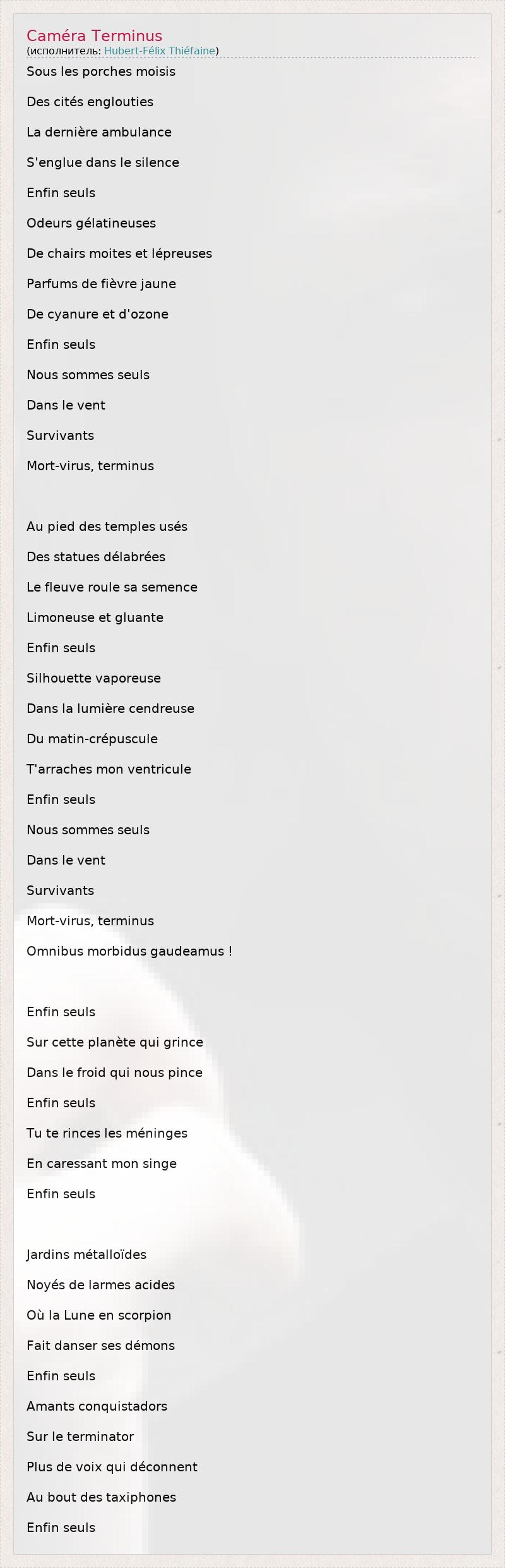 Sous les porches moisis Des cités englouties La dernière ambulance S'englue dans le silence Enfin seuls Odeurs gélatineuses De chairs moites et lépreuses Parfums de fièvre jaune De cyanure et d'ozone Enfin seuls Nous sommes seuls Dans le vent Survivants Mort-virus, terminus Au pied des temples usés Des statues délabrées Le fleuve roule sa semence Limoneuse et gluante Enfin seuls Silhouette vaporeuse Dans la lumière cendreuse Du matin-crépuscule T'arraches mon ventricule Enfin seuls Nous sommes seuls Dans le vent Survivants Mort-virus, terminus Omnibus morbidus gaudeamus ! Enfin seuls Sur cette planète qui grince Dans le froid qui nous pince Enfin seuls Tu te rinces les méninges En caressant mon singe Enfin seuls Jardins métalloïdes Noyés de larmes acides Où la Lune en scorpion Fait danser ses démons Enfin seuls Amants conquistadors Sur le terminator Plus de voix qui déconnent Au bout des taxiphones Enfin seuls