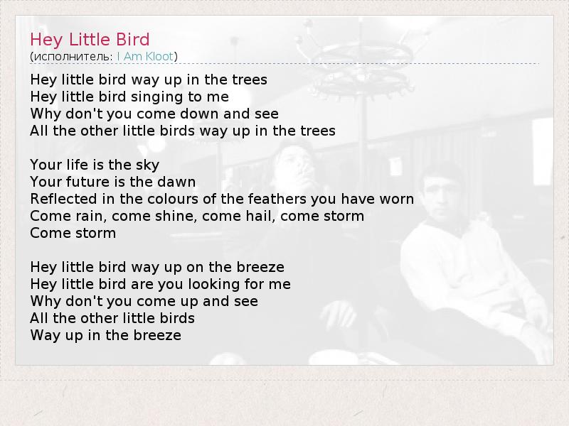А как ты думаешь, о чем песня "Hey Little Bird" ?