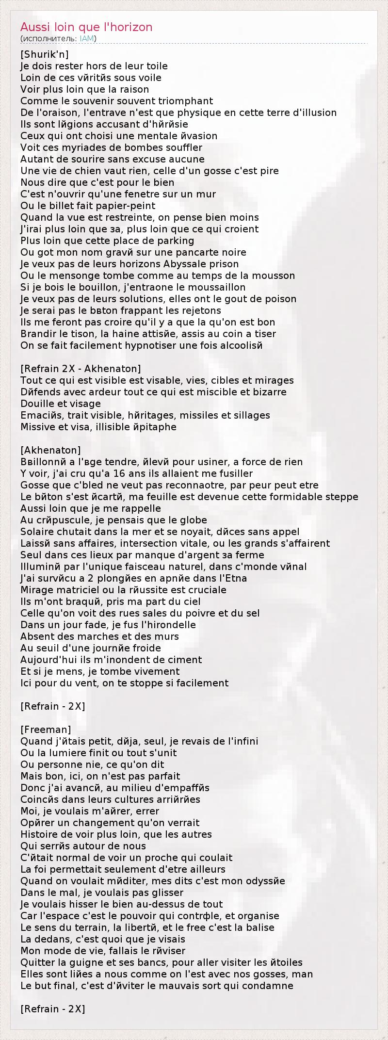 [Shurik'n] Je dois rester hors de leur toile Loin de ces vйritйs sous voile Voir plus loin que la raison Comme le souvenir souvent triomphant De l'oraison, l'entrave n'est que physique en cette terre d'illusion Ils sont lйgions accusant d'hйrйsie Ceux qui ont choisi une mentale йvasion Voit ces myriades de bombes souffler Autant de sourire sans excuse aucune Une vie de chien vaut rien, celle d'un gosse c'est pire Nous dire que c'est pour le bien C'est n'ouvrir qu'une fenetre sur un mur Ou le billet fait papier-peint Quand la vue est restreinte, on pense bien moins J'irai plus loin que зa, plus loin que ce qui croient Plus loin que cette place de parking Ou gоt mon nom gravй sur une pancarte noire Je veux pas de leurs horizons Abyssale prison Ou le mensonge tombe comme au temps de la mousson Si je bois le bouillon, j'entraоne le moussaillon Je veux pas de leurs solutions, elles ont le gout de poison Je serai pas le bвton frappant les rejetons Ils me feront pas croire qu'il y a que la qu'on est bon Brandir le tison, la haine attisйe, assis au coin a tiser On se fait facilement hypnotiser une fois alcoolisй [Refrain 2X - Akhenaton] Tout ce qui est visible est visable, vies, cibles et mirages Dйfends avec ardeur tout ce qui est miscible et bizarre Douille et visage Emaciйs, trait visible, hйritages, missiles et sillages Missive et visa, illisible йpitaphe [Akhenaton] Bвillonnй a l'вge tendre, йlevй pour usiner, a force de rien Y voir, j'ai cru qu'a 16 ans ils allaient me fusiller Gosse que c'bled ne veut pas reconnaоtre, par peur peut etre Le bйton s'est йcartй, ma feuille est devenue cette formidable steppe Aussi loin que je me rappelle Au crйpuscule, je pensais que le globe Solaire chutait dans la mer et se noyait, dйces sans appel Laissй sans affaires, intersection vitale, ou les grands s'affairent Seul dans ces lieux par manque d'argent зa ferme Illuminй par l'unique faisceau naturel, dans c'monde vйnal J'ai survйcu a 2 plongйes en apnйe dans l'Etna Mirage matriciel ou la rйussite est cruciale Ils m'ont braquй, pris ma part du ciel Celle qu'on voit des rues sales du poivre et du sel Dans un jour fade, je fus l'hirondelle Absent des marches et des murs Au seuil d'une journйe froide Aujourd'hui ils m'inondent de ciment Et si je mens, je tombe vivement Ici pour du vent, on te stoppe si facilement [Refrain - 2X] [Freeman] Quand j'йtais petit, dйja, seul, je revais de l'infini Ou la lumiere finit ou tout s'unit Ou personne nie, ce qu'on dit Mais bon, ici, on n'est pas parfait Donc j'ai avancй, au milieu d'empaffйs Coincйs dans leurs cultures arriйrйes Moi, je voulais m'aйrer, errer Opйrer un changement qu'on verrait Histoire de voir plus loin, que les autres Qui serrйs autour de nous C'йtait normal de voir un proche qui coulait La foi permettait seulement d'etre ailleurs Quand on voulait mйditer, mes dits c'est mon odyssйe Dans le mal, je voulais pas glisser Je voulais hisser le bien au-dessus de tout Car l'espace c'est le pouvoir qui contrфle, et organise Le sens du terrain, la libertй, et le free c'est la balise La dedans, c'est quoi que je visais Mon mode de vie, fallais le rйviser Quitter la guigne et ses bancs, pour aller visiter les йtoiles Elles sont liйes a nous comme on l'est avec nos gosses, man Le but final, c'est d'йviter le mauvais sort qui condamne [Refrain - 2X]