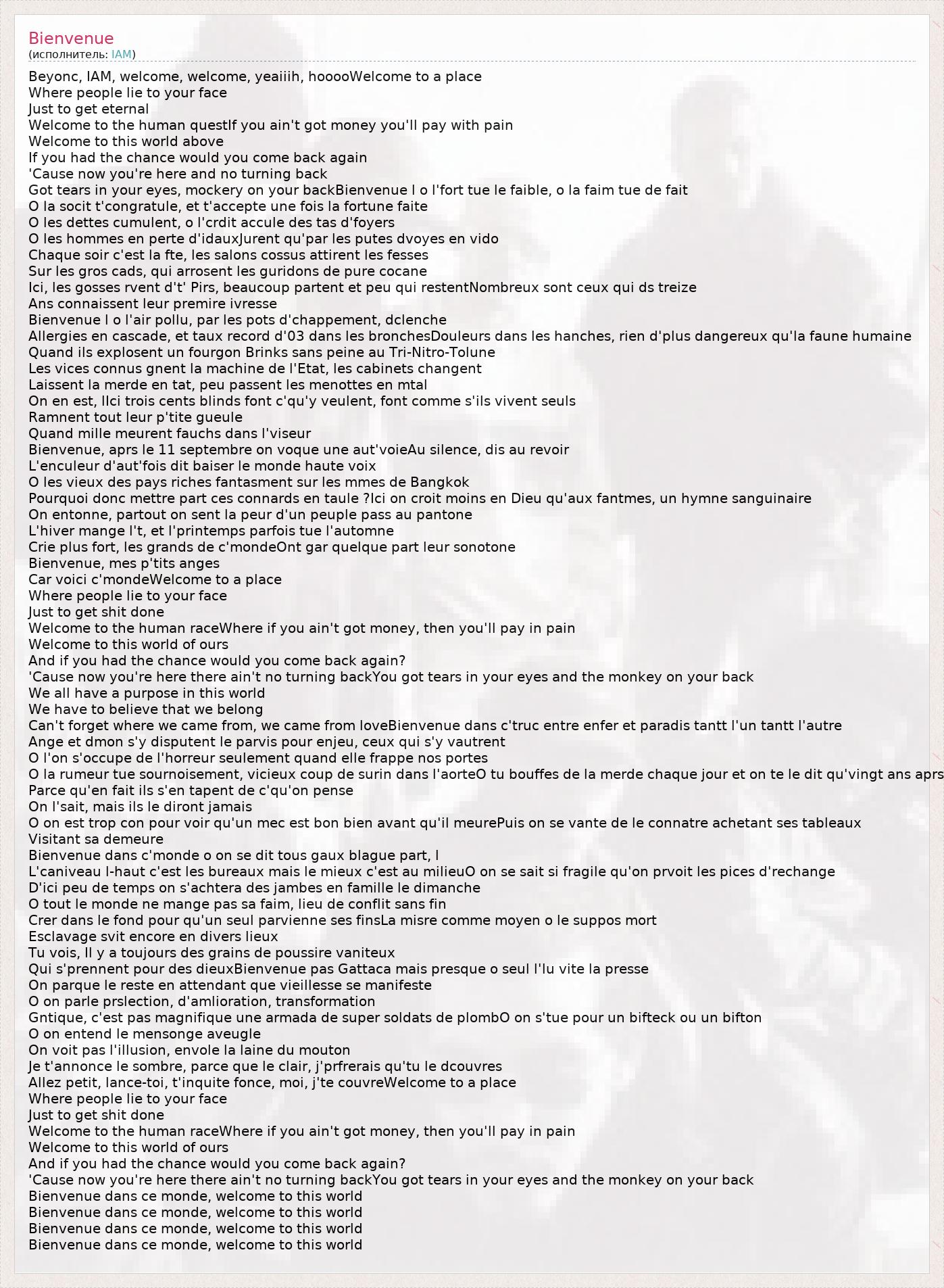 Beyonc, IAM, welcome, welcome, yeaiiih, hooooWelcome to a place Where people lie to your face Just to get eternal Welcome to the human questIf you ain't got money you'll pay with pain Welcome to this world above If you had the chance would you come back again 'Cause now you're here and no turning back Got tears in your eyes, mockery on your backBienvenue l o l'fort tue le faible, o la faim tue de fait O la socit t'congratule, et t'accepte une fois la fortune faite O les dettes cumulent, o l'crdit accule des tas d'foyers O les hommes en perte d'idauxJurent qu'par les putes dvoyes en vido Chaque soir c'est la fte, les salons cossus attirent les fesses Sur les gros cads, qui arrosent les guridons de pure cocane Ici, les gosses rvent d't' Pirs, beaucoup partent et peu qui restentNombreux sont ceux qui ds treize Ans connaissent leur premire ivresse Bienvenue l o l'air pollu, par les pots d'chappement, dclenche Allergies en cascade, et taux record d'03 dans les bronchesDouleurs dans les hanches, rien d'plus dangereux qu'la faune humaine Quand ils explosent un fourgon Brinks sans peine au Tri-Nitro-Tolune Les vices connus gnent la machine de l'Etat, les cabinets changent Laissent la merde en tat, peu passent les menottes en mtal On en est, lIci trois cents blinds font c'qu'y veulent, font comme s'ils vivent seuls Ramnent tout leur p'tite gueule Quand mille meurent fauchs dans l'viseur Bienvenue, aprs le 11 septembre on voque une aut'voieAu silence, dis au revoir L'enculeur d'aut'fois dit baiser le monde haute voix O les vieux des pays riches fantasment sur les mmes de Bangkok Pourquoi donc mettre part ces connards en taule ?Ici on croit moins en Dieu qu'aux fantmes, un hymne sanguinaire On entonne, partout on sent la peur d'un peuple pass au pantone L'hiver mange l't, et l'printemps parfois tue l'automne Crie plus fort, les grands de c'mondeOnt gar quelque part leur sonotone Bienvenue, mes p'tits anges Car voici c'mondeWelcome to a place Where people lie to your face Just to get shit done Welcome to the human raceWhere if you ain't got money, then you'll pay in pain Welcome to this world of ours And if you had the chance would you come back again? 'Cause now you're here there ain't no turning backYou got tears in your eyes and the monkey on your back We all have a purpose in this world We have to believe that we belong Can't forget where we came from, we came from loveBienvenue dans c'truc entre enfer et paradis tantt l'un tantt l'autre Ange et dmon s'y disputent le parvis pour enjeu, ceux qui s'y vautrent O l'on s'occupe de l'horreur seulement quand elle frappe nos portes O la rumeur tue sournoisement, vicieux coup de surin dans l'aorteO tu bouffes de la merde chaque jour et on te le dit qu'vingt ans aprs Parce qu'en fait ils s'en tapent de c'qu'on pense On l'sait, mais ils le diront jamais O on est trop con pour voir qu'un mec est bon bien avant qu'il meurePuis on se vante de le connatre achetant ses tableaux Visitant sa demeure Bienvenue dans c'monde o on se dit tous gaux blague part, l L'caniveau l-haut c'est les bureaux mais le mieux c'est au milieuO on se sait si fragile qu'on prvoit les pices d'rechange D'ici peu de temps on s'achtera des jambes en famille le dimanche O tout le monde ne mange pas sa faim, lieu de conflit sans fin Crer dans le fond pour qu'un seul parvienne ses finsLa misre comme moyen o le suppos mort Esclavage svit encore en divers lieux Tu vois, Il y a toujours des grains de poussire vaniteux Qui s'prennent pour des dieuxBienvenue pas Gattaca mais presque o seul l'lu vite la presse On parque le reste en attendant que vieillesse se manifeste O on parle prslection, d'amlioration, transformation Gntique, c'est pas magnifique une armada de super soldats de plombO on s'tue pour un bifteck ou un bifton O on entend le mensonge aveugle On voit pas l'illusion, envole la laine du mouton Je t'annonce le sombre, parce que le clair, j'prfrerais qu'tu le dcouvres Allez petit, lance-toi, t'inquite fonce, moi, j'te couvreWelcome to a place Where people lie to your face Just to get shit done Welcome to the human raceWhere if you ain't got money, then you'll pay in pain Welcome to this world of ours And if you had the chance would you come back again? 'Cause now you're here there ain't no turning backYou got tears in your eyes and the monkey on your back Bienvenue dans ce monde, welcome to this world Bienvenue dans ce monde, welcome to this world Bienvenue dans ce monde, welcome to this world Bienvenue dans ce monde, welcome to this world