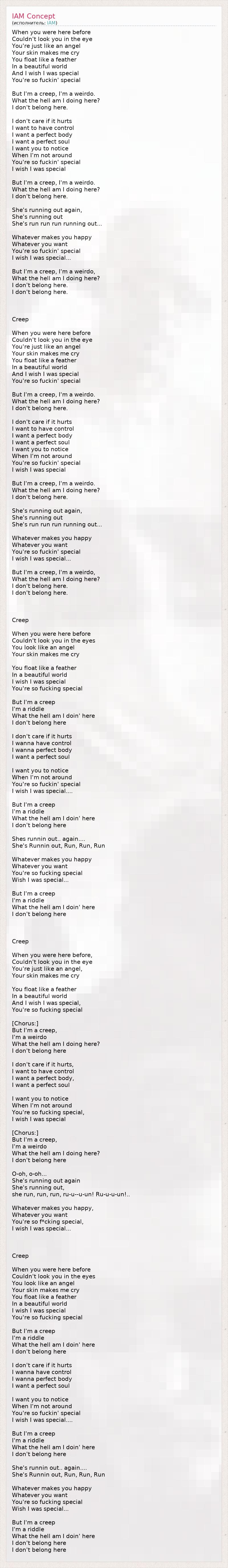 When you were here before Couldn't look you in the eye You're just like an angel Your skin makes me cry You float like a feather In a beautiful world And I wish I was special You're so fuckin' special But I'm a creep, I'm a weirdo. What the hell am I doing here? I don't belong here. I don't care if it hurts I want to have control I want a perfect body I want a perfect soul I want you to notice When I'm not around You're so fuckin' special I wish I was special But I'm a creep, I'm a weirdo. What the hell am I doing here? I don't belong here. She's running out again, She's running out She's run run run running out... Whatever makes you happy Whatever you want You're so fuckin' special I wish I was special... But I'm a creep, I'm a weirdo, What the hell am I doing here? I don't belong here. I don't belong here. Creep When you were here before Couldn't look you in the eye You're just like an angel Your skin makes me cry You float like a feather In a beautiful world And I wish I was special You're so fuckin' special But I'm a creep, I'm a weirdo. What the hell am I doing here? I don't belong here. I don't care if it hurts I want to have control I want a perfect body I want a perfect soul I want you to notice When I'm not around You're so fuckin' special I wish I was special But I'm a creep, I'm a weirdo. What the hell am I doing here? I don't belong here. She's running out again, She's running out She's run run run running out... Whatever makes you happy Whatever you want You're so fuckin' special I wish I was special... But I'm a creep, I'm a weirdo, What the hell am I doing here? I don't belong here. I don't belong here. Creep When you were here before Couldn't look you in the eyes You look like an angel Your skin makes me cry You float like a feather In a beautiful world I wish I was special You're so fucking special But I'm a creep I'm a riddle What the hell am I doin' here I don't belong here I don't care if it hurts I wanna have control I wanna perfect body I want a perfect soul I want you to notice When I'm not around You're so fuckin' special I wish I was special.... But I'm a creep I'm a riddle What the hell am I doin' here I don't belong here Shes runnin out.. again.... She's Runnin out, Run, Run, Run Whatever makes you happy Whatever you want You're so fucking special Wish I was special... But I'm a creep I'm a riddle What the hell am I doin' here I don't belong here Creep When you were here before, Couldn't look you in the eye You're just like an angel, Your skin makes me cry You float like a feather In a beautiful world And I wish I was special, You're so fucking special [Chorus:] But I'm a creep, I'm a weirdo What the hell am I doing here? I don't belong here I don't care if it hurts, I want to have control I want a perfect body, I want a perfect soul I want you to notice When I'm not around You're so fucking special, I wish I was special [Chorus:] But I'm a creep, I'm a weirdo What the hell am I doing here? I don't belong here O-oh, o-oh... She's running out again She's running out, she run, run, run, ru-u--u-un! Ru-u-u-un!.. Whatever makes you happy, Whatever you want You're so f*cking special, I wish I was special... Creep When you were here before Couldn't look you in the eyes You look like an angel Your skin makes me cry You float like a feather In a beautiful world I wish I was special You're so fucking special But I'm a creep I'm a riddle What the hell am I doin' here I don't belong here I don't care if it hurts I wanna have control I wanna perfect body I want a perfect soul I want you to notice When I'm not around You're so fuckin' special I wish I was special.... But I'm a creep I'm a riddle What the hell am I doin' here I don't belong here She's runnin out.. again.... She's Runnin out, Run, Run, Run Whatever makes you happy Whatever you want You're so fucking special Wish I was special... But I'm a creep I'm a riddle What the hell am I doin' here I don't belong here I don't belong here