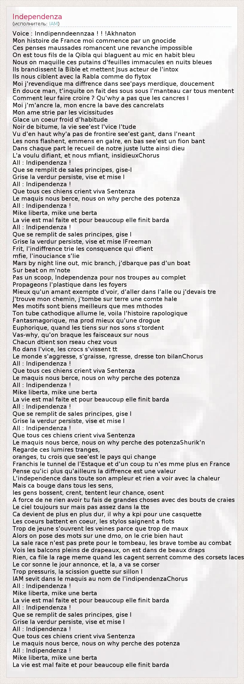 Voice : Inndipenndeennzaa ! ! !Akhnaton Mon histoire de France moi commence par un gnocide Ces penses maussades romancent une revanche impossible On est tous fils de la Qibla qui blaguent au mic en habit bleu Nous on maquille ces putains d'feuilles immacules en nuits bleues Ils brandissent la Bible et mettent Jsus acteur de l'intox Ils nous ciblent avec la Rabla comme do flytox Moi j'revendique ma diffrence dans see'pays merdique, doucement En douce man, t'inquite on fait des sous sous l'manteau car tous mentent Comment leur faire croire ? Qu'why a pas que les cancres l Moi j'm'ancre la, mon encre la bave des cancrelats Mon ame strie par les vicissitudes Glace un coeur froid d'habitude Noir de bitume, la vie see'est l'vice l'tude Vu d'en haut why'a pas de frontire see'est gant, dans l'neant Les nons flashent, emmens en galre, en bas see'est un fion bant Dans chaque part le recueil de notre juste lutte ainsi dieu L'a voulu difiant, et nous mfiant, insidieuxChorus All : Indipendenza ! Que se remplit de sales principes, gise-l Grise la verdur persiste, vise et mise l All : Indipendenza ! Que tous ces chiens crient viva Sentenza Le maquis nous berce, nous on why perche des potenza All : Indipendenza ! Mike liberta, mike une berta La vie est mal faite et pour beaucoup elle finit barda All : Indipendenza ! Que se remplit de sales principes, gise l Grise la verdur persiste, vise et mise lFreeman Frit, l'indiffrence trie les consquence qui dfient mfie, l'inouciance s'lie Mars by night line out, mic branch, j'dbarque pas d'un boat Sur beat on m'note Pas un scoop, Independenza pour nos troupes au complet Propageons l'plastique dans les foyers Mieux qu'un amant exempte d'voir, d'aller dans l'alle ou j'devais tre J'trouve mon chemin, j'tombe sur terre une comte hale Mes motifs sont biens meilleurs que mes mthodes Ton tube cathodique allume le, voila l'histoire rapologique Fantasmagorique, ma prod mieux qu'une drogue Euphorique, quand les tiens sur nos sons s'tordent Vas-why, qu'on braque les faisceaux sur nous Chacun dtient son rseau chez vous Ro dans l'vice, les crocs s'vissent tt Le monde s'aggresse, s'graisse, rgresse, dresse ton bilanChorus All : Indipendenza ! Que tous ces chiens crient viva Sentenza Le maquis nous berce, nous on why perche des potenza All : Indipendenza ! Mike liberta, mike une berta La vie est mal faite et pour beaucoup elle finit barda All : Indipendenza ! Que se remplit de sales principes, gise l Grise la verdur persiste, vise et mise l All : Indipendenza ! Que tous ces chiens crient viva Sentenza Le maquis nous berce, nous on why perche des potenzaShurik'n Regarde ces lumires tranges, oranges, tu crois que see'est le pays qui change Franchis le tunnel de l'Estaque et d'un coup tu n'es mme plus en France Pense qu'ici plus qu'ailleurs la diffrence est une valeur L'independence dans toute son ampleur et rien a voir avec la chaleur Mais ca bouge dans tous les sens, les gens bossent, crent, tentent leur chance, osent A force de ne rien avoir tu fais de grandes choses avec des bouts de craies Le ciel toujours sur mais pas assez dans la tte Ca devient de plus en plus dur, il why a kpi pour une casquette Les coeurs battent en coeur, les stylos saignent a flots Trop de jeune s'ouvrent les veines parce que trop de maux Alors on pose des mots sur une dmo, on le crie bien haut La sale race n'est pas prete pour le tombeau, les brave tombe au combat Vois les balcons pleins de drapeaux, on est dans de beaux draps Rien, ca file la rage meme quand les cagent serrent comme des corsets laces Le cor sonne le jour annonce, et la, a va se corser Trop pressuris, la scission guette sur sillon l IAM sevit dans le maquis au nom de l'indipendenzaChorus All : Indipendenza ! Mike liberta, mike une berta La vie est mal faite et pour beaucoup elle finit barda All : Indipendenza ! Que se remplit de sales principes, gise l Grise la verdur persiste, vise et mise l All : Indipendenza ! Que tous ces chiens crient viva Sentenza Le maquis nous berce, nous on why perche des potenza All : Indipendenza ! Mike liberta, mike une berta La vie est mal faite et pour beaucoup elle finit barda