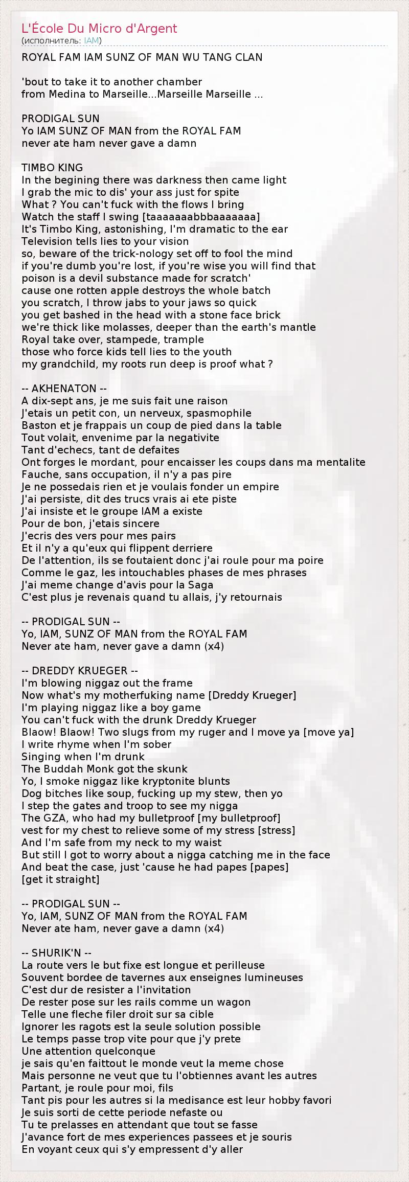 ROYAL FAM IAM SUNZ OF MAN WU TANG CLAN 'bout to take it to another chamber from Medina to Marseille...Marseille Marseille ... PRODIGAL SUN Yo IAM SUNZ OF MAN from the ROYAL FAM never ate ham never gave a damn TIMBO KING In the begining there was darkness then came light I grab the mic to dis' your ass just for spite What ? You can't fuck with the flows I bring Watch the staff I swing [taaaaaaabbbaaaaaaa] It's Timbo King, astonishing, I'm dramatic to the ear Television tells lies to your vision so, beware of the trick-nology set off to fool the mind if you're dumb you're lost, if you're wise you will find that poison is a devil substance made for scratch' cause one rotten apple destroys the whole batch you scratch, I throw jabs to your jaws so quick you get bashed in the head with a stone face brick we're thick like molasses, deeper than the earth's mantle Royal take over, stampede, trample those who force kids tell lies to the youth my grandchild, my roots run deep is proof what ? -- AKHENATON -- A dix-sept ans, je me suis fait une raison J'etais un petit con, un nerveux, spasmophile Baston et je frappais un coup de pied dans la table Tout volait, envenime par la negativite Tant d'echecs, tant de defaites Ont forges le mordant, pour encaisser les coups dans ma mentalite Fauche, sans occupation, il n'y a pas pire Je ne possedais rien et je voulais fonder un empire J'ai persiste, dit des trucs vrais ai ete piste J'ai insiste et le groupe IAM a existe Pour de bon, j'etais sincere J'ecris des vers pour mes pairs Et il n'y a qu'eux qui flippent derriere De l'attention, ils se foutaient donc j'ai roule pour ma poire Comme le gaz, les intouchables phases de mes phrases J'ai meme change d'avis pour la Saga C'est plus je revenais quand tu allais, j'y retournais -- PRODIGAL SUN -- Yo, IAM, SUNZ OF MAN from the ROYAL FAM Never ate ham, never gave a damn (x4) -- DREDDY KRUEGER -- I'm blowing niggaz out the frame Now what's my motherfuking name [Dreddy Krueger] I'm playing niggaz like a boy game You can't fuck with the drunk Dreddy Krueger Blaow! Blaow! Two slugs from my ruger and I move ya [move ya] I write rhyme when I'm sober Singing when I'm drunk The Buddah Monk got the skunk Yo, I smoke niggaz like kryptonite blunts Dog bitches like soup, fucking up my stew, then yo I step the gates and troop to see my nigga The GZA, who had my bulletproof [my bulletproof] vest for my chest to relieve some of my stress [stress] And I'm safe from my neck to my waist But still I got to worry about a nigga catching me in the face And beat the case, just 'cause he had papes [papes] [get it straight] -- PRODIGAL SUN -- Yo, IAM, SUNZ OF MAN from the ROYAL FAM Never ate ham, never gave a damn (x4) -- SHURIK'N -- La route vers le but fixe est longue et perilleuse Souvent bordee de tavernes aux enseignes lumineuses C'est dur de resister a l'invitation De rester pose sur les rails comme un wagon Telle une fleche filer droit sur sa cible Ignorer les ragots est la seule solution possible Le temps passe trop vite pour que j'y prete Une attention quelconque je sais qu'en faittout le monde veut la meme chose Mais personne ne veut que tu l'obtiennes avant les autres Partant, je roule pour moi, fils Tant pis pour les autres si la medisance est leur hobby favori Je suis sorti de cette periode nefaste ou Tu te prelasses en attendant que tout se fasse J'avance fort de mes experiences passees et je souris En voyant ceux qui s'y empressent d'y aller