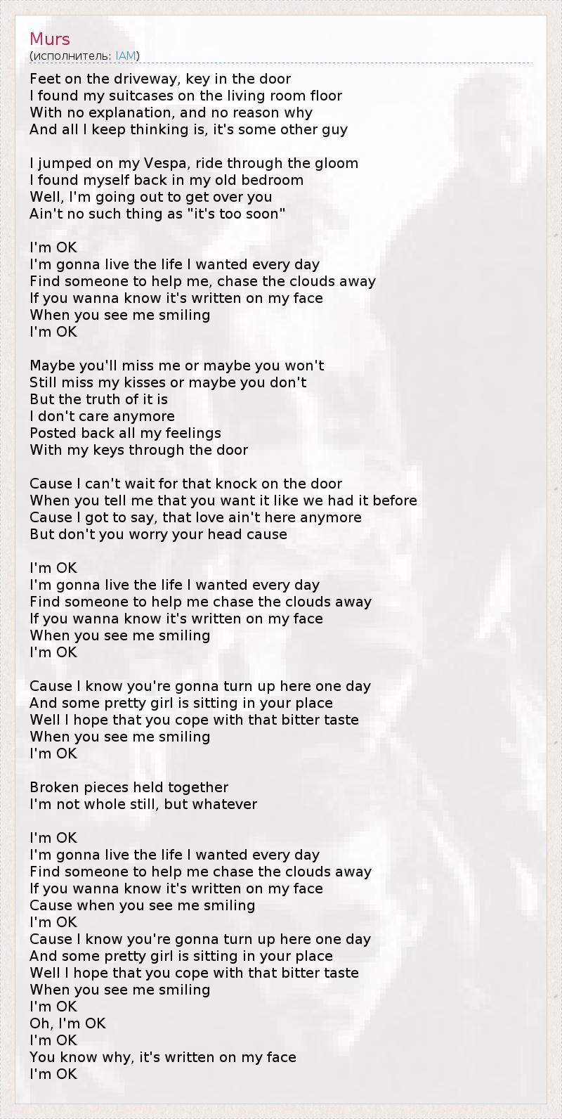 Подойдя к дому, увидел ключ в двери, В гостиной - чемодан с моими вещами. Без каких-либо объяснений, без причин. Всё, о чём я думаю - у тебя есть другой. Прыгаю на свой Vespa и проникаю в тьму мыслей, Ощущая себя снова в своей кровати. Ладно, я ухожу, чтобы забыть тебя, И без всяких штук, типа: "Почему всё произошло так скоро?" Я в порядке! Я буду жить той жизнью, о которой мечтал. Найду того, кто поможет разогнать серые тучи. Если хочешь знать - всё написано на моём лице. И если я улыбаюсь - Я в порядке! Может, ты будешь скучать по мне, Скучать по моим поцелуям. Но правда такова - Мне всё равно. Я вернул тебе свои чувства, просунув их Под дверь вместе с ключом. Я не буду ждать стука в дверь, Даже если ты захочешь вернуть всё былое. Ведь я уже сказал - в моём сердце больше нет места для тебя. Но ты не волнуйся за меня, потому что... Я в порядке! Я буду жить той жизнью, о которой мечтал. Найду того, кто поможет разогнать серые тучи. Если хочешь знать - всё написано на моём лице. И если я улыбаюсь - Я в порядке! Знаю, однажды ты заявишься, А твоё место будет занято какой-нибудь красавицей... Надеюсь, ты справишься с горьким послевкусием. Если ты видишь мою улыбку, знай - Я в порядке! Осколки склеиваются вновь. Пока я не обрёл целостность, но всё же... Я в порядке! Я буду жить той жизнью, о которой мечтал. Найду того, кто поможет разогнать серые тучи. Если хочешь знать - всё написано на моём лице. И если я улыбаюсь - Я в порядке! Знаю, однажды ты заявишься, А твоё место будет занято какой-нибудь красавицей... Надеюсь, ты справишься с горьким послевкусием. Если ты видишь мою улыбку, знай - Я в порядке! Оуу, всё в порядке! Я в порядке! Ты знаешь почему, ведь всё у меня на лице - Я в порядке! 1 - дословно: назад