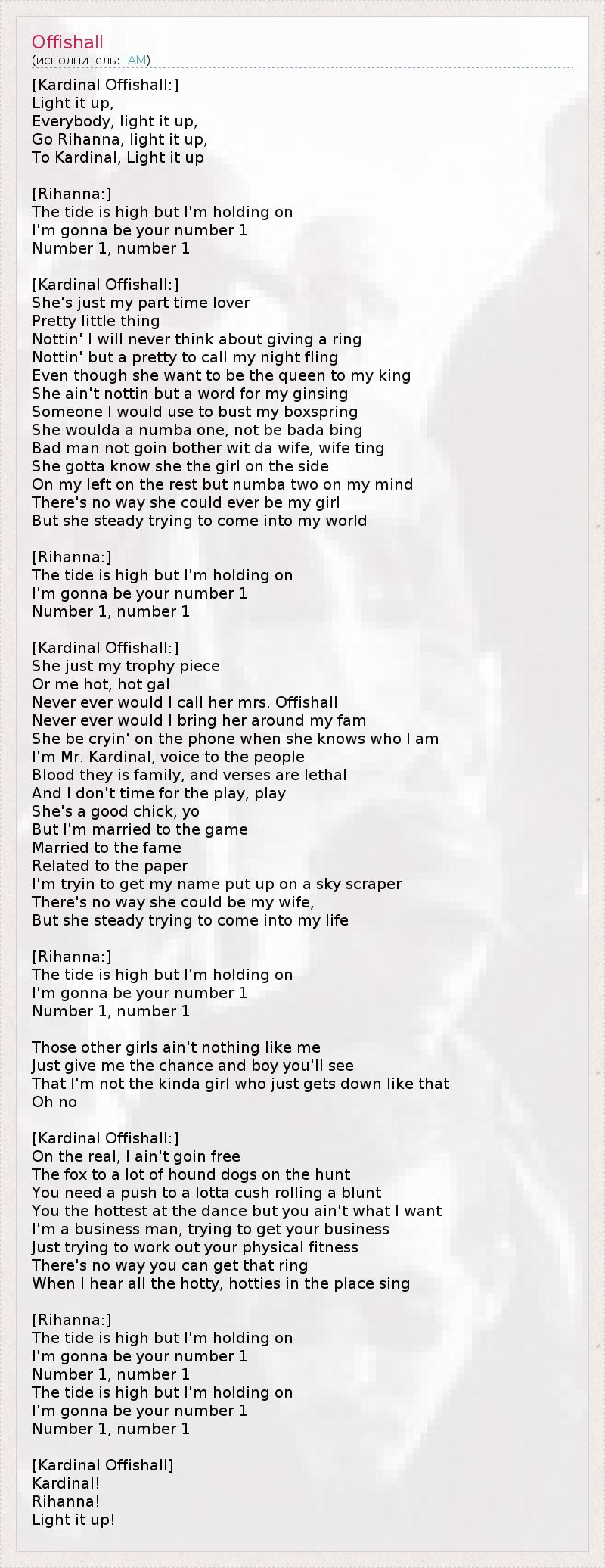 [Kardinal Offishall:] Light it up, Everybody, light it up, Go Rihanna, light it up, To Kardinal, Light it up [Rihanna:] The tide is high but I'm holding on I'm gonna be your number 1 Number 1, number 1 [Kardinal Offishall:] She's just my part time lover Pretty little thing Nottin' I will never think about giving a ring Nottin' but a pretty to call my night fling Even though she want to be the queen to my king She ain't nottin but a word for my ginsing Someone I would use to bust my boxspring She woulda a numba one, not be bada bing Bad man not goin bother wit da wife, wife ting She gotta know she the girl on the side On my left on the rest but numba two on my mind There's no way she could ever be my girl But she steady trying to come into my world [Rihanna:] The tide is high but I'm holding on I'm gonna be your number 1 Number 1, number 1 [Kardinal Offishall:] She just my trophy piece Or me hot, hot gal Never ever would I call her mrs. Offishall Never ever would I bring her around my fam She be cryin' on the phone when she knows who I am I'm Mr. Kardinal, voice to the people Blood they is family, and verses are lethal And I don't time for the play, play She's a good chick, yo But I'm married to the game Married to the fame Related to the paper I'm tryin to get my name put up on a sky scraper There's no way she could be my wife, But she steady trying to come into my life [Rihanna:] The tide is high but I'm holding on I'm gonna be your number 1 Number 1, number 1 Those other girls ain't nothing like me Just give me the chance and boy you'll see That I'm not the kinda girl who just gets down like that Oh no [Kardinal Offishall:] On the real, I ain't goin free The fox to a lot of hound dogs on the hunt You need a push to a lotta cush rolling a blunt You the hottest at the dance but you ain't what I want I'm a business man, trying to get your business Just trying to work out your physical fitness There's no way you can get that ring When I hear all the hotty, hotties in the place sing [Rihanna:] The tide is high but I'm holding on I'm gonna be your number 1 Number 1, number 1 The tide is high but I'm holding on I'm gonna be your number 1 Number 1, number 1 [Kardinal Offishall] Kardinal! Rihanna! Light it up!