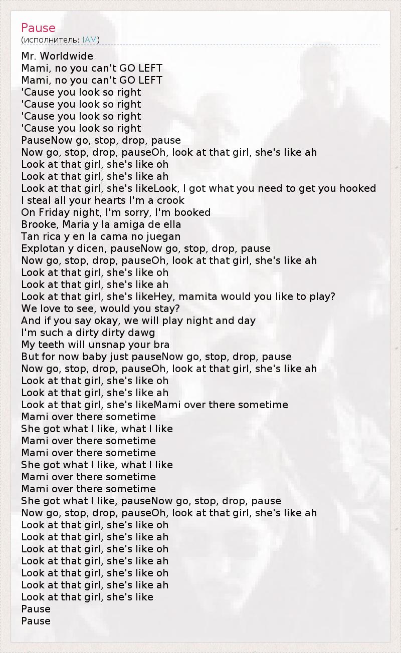 Mr. Worldwide Mami, no you can't GO LEFT Mami, no you can't GO LEFT 'Cause you look so right 'Cause you look so right 'Cause you look so right 'Cause you look so right PauseNow go, stop, drop, pause Now go, stop, drop, pauseOh, look at that girl, she's like ah Look at that girl, she's like oh Look at that girl, she's like ah Look at that girl, she's likeLook, I got what you need to get you hooked I steal all your hearts I'm a crook On Friday night, I'm sorry, I'm booked Brooke, Maria y la amiga de ella Tan rica y en la cama no juegan Explotan y dicen, pauseNow go, stop, drop, pause Now go, stop, drop, pauseOh, look at that girl, she's like ah Look at that girl, she's like oh Look at that girl, she's like ah Look at that girl, she's likeHey, mamita would you like to play? We love to see, would you stay? And if you say okay, we will play night and day I'm such a dirty dirty dawg My teeth will unsnap your bra But for now baby just pauseNow go, stop, drop, pause Now go, stop, drop, pauseOh, look at that girl, she's like ah Look at that girl, she's like oh Look at that girl, she's like ah Look at that girl, she's likeMami over there sometime Mami over there sometime She got what I like, what I like Mami over there sometime Mami over there sometime She got what I like, what I like Mami over there sometime Mami over there sometime She got what I like, pauseNow go, stop, drop, pause Now go, stop, drop, pauseOh, look at that girl, she's like ah Look at that girl, she's like oh Look at that girl, she's like ah Look at that girl, she's like oh Look at that girl, she's like ah Look at that girl, she's like oh Look at that girl, she's like ah Look at that girl, she's like Pause Pause