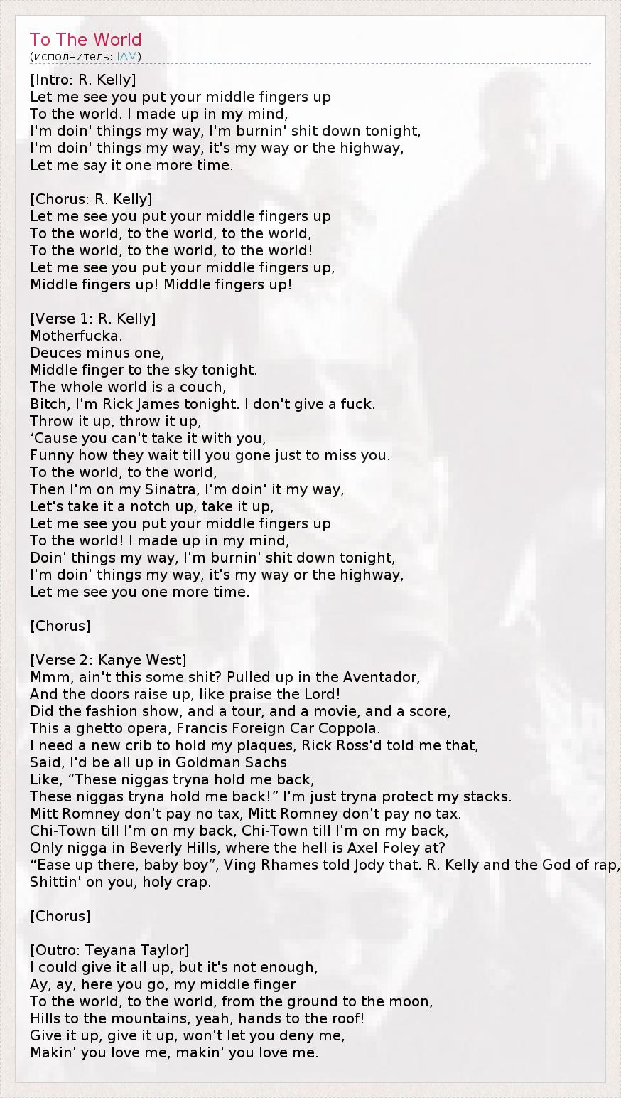 [Intro: R. Kelly] Let me see you put your middle fingers up To the world. I made up in my mind, I'm doin' things my way, I'm burnin' shit down tonight, I'm doin' things my way, it's my way or the highway, Let me say it one more time. [Chorus: R. Kelly] Let me see you put your middle fingers up To the world, to the world, to the world, To the world, to the world, to the world! Let me see you put your middle fingers up, Middle fingers up! Middle fingers up! [Verse 1: R. Kelly] Motherfucka. Deuces minus one, Middle finger to the sky tonight. The whole world is a couch, Bitch, I'm Rick James tonight. I don't give a fuck. Throw it up, throw it up, ‘Cause you can't take it with you, Funny how they wait till you gone just to miss you. To the world, to the world, Then I'm on my Sinatra, I'm doin' it my way, Let's take it a notch up, take it up, Let me see you put your middle fingers up To the world! I made up in my mind, Doin' things my way, I'm burnin' shit down tonight, I'm doin' things my way, it's my way or the highway, Let me see you one more time. [Chorus] [Verse 2: Kanye West] Mmm, ain't this some shit? Pulled up in the Aventador, And the doors raise up, like praise the Lord! Did the fashion show, and a tour, and a movie, and a score, This a ghetto opera, Francis Foreign Car Coppola. I need a new crib to hold my plaques, Rick Ross'd told me that, Said, I'd be all up in Goldman Sachs Like, “These niggas tryna hold me back, These niggas tryna hold me back!” I'm just tryna protect my stacks. Mitt Romney don't pay no tax, Mitt Romney don't pay no tax. Chi-Town till I'm on my back, Chi-Town till I'm on my back, Only nigga in Beverly Hills, where the hell is Axel Foley at? “Ease up there, baby boy”, Ving Rhames told Jody that. R. Kelly and the God of rap, Shittin' on you, holy crap. [Chorus] [Outro: Teyana Taylor] I could give it all up, but it's not enough, Ay, ay, here you go, my middle finger To the world, to the world, from the ground to the moon, Hills to the mountains, yeah, hands to the roof! Give it up, give it up, won't let you deny me, Makin' you love me, makin' you love me.