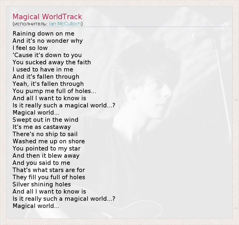 Raining down on me And it's no wonder why I feel so low 'Cause it's down to you You sucked away the faith I used to have in me And it's fallen through Yeah, it's fallen through You pump me full of holes... And all I want to know is Is it really such a magical world...? Magical world... Swept out in the wind It's me as castaway There's no ship to sail Washed me up on shore You pointed to my star And then it blew away And you said to me That's what stars are for They fill you full of holes Silver shining holes And all I want to know is Is it really such a magical world...? Magical world...