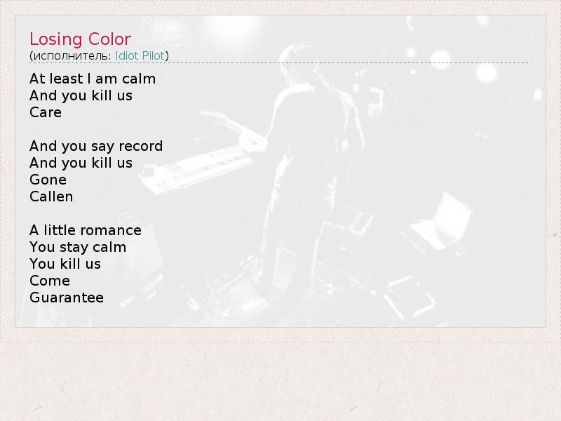 At least I am calm And you kill us Care And you say record And you kill us Gone Callen A little romance You stay calm You kill us Come Guarantee