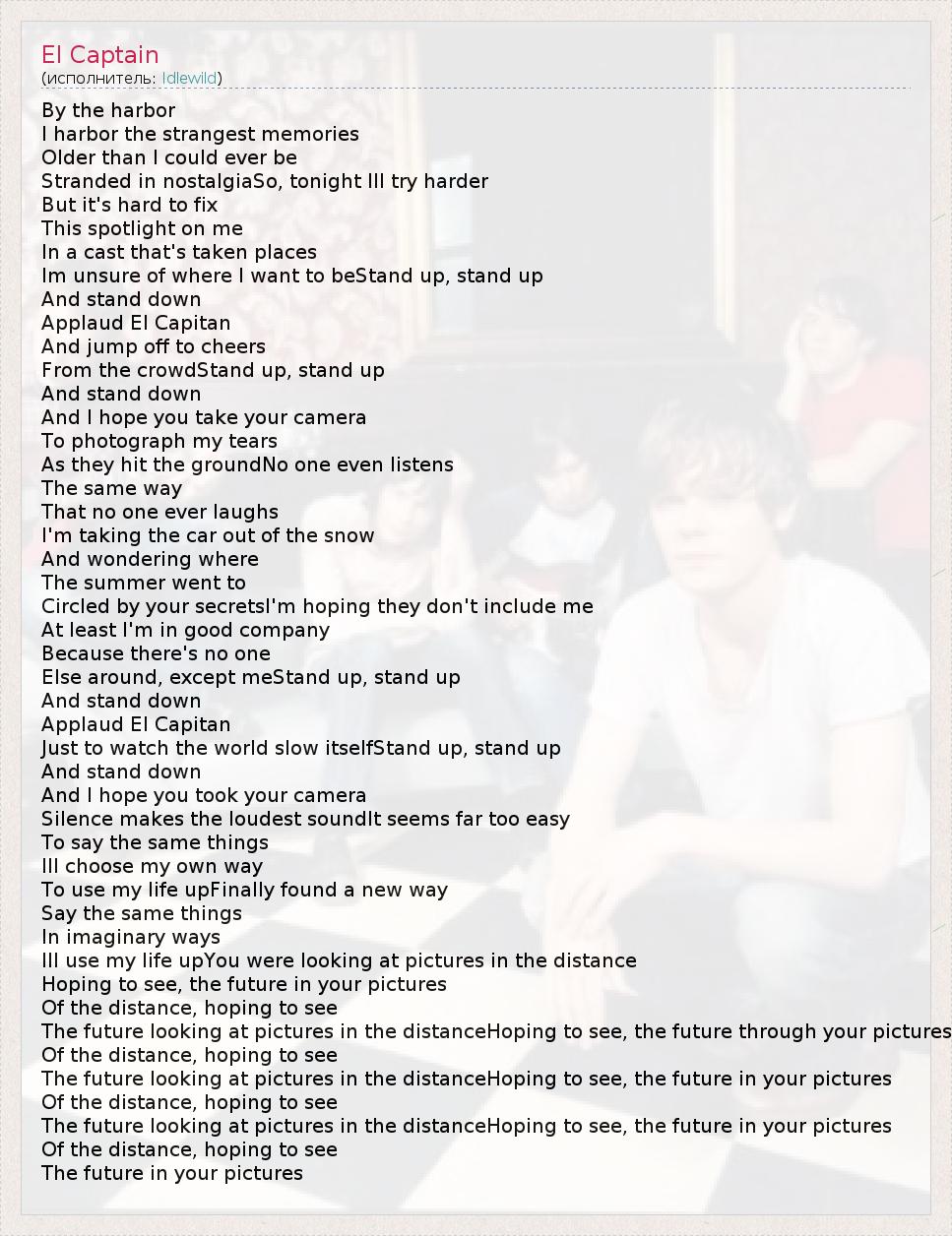 By the harbor I harbor the strangest memories Older than I could ever be Stranded in nostalgiaSo, tonight Ill try harder But it's hard to fix This spotlight on me In a cast that's taken places Im unsure of where I want to beStand up, stand up And stand down Applaud El Capitan And jump off to cheers From the crowdStand up, stand up And stand down And I hope you take your camera To photograph my tears As they hit the groundNo one even listens The same way That no one ever laughs I'm taking the car out of the snow And wondering where The summer went to Circled by your secretsI'm hoping they don't include me At least I'm in good company Because there's no one Else around, except meStand up, stand up And stand down Applaud El Capitan Just to watch the world slow itselfStand up, stand up And stand down And I hope you took your camera Silence makes the loudest soundIt seems far too easy To say the same things Ill choose my own way To use my life upFinally found a new way Say the same things In imaginary ways Ill use my life upYou were looking at pictures in the distance Hoping to see, the future in your pictures Of the distance, hoping to see The future looking at pictures in the distanceHoping to see, the future through your pictures Of the distance, hoping to see The future looking at pictures in the distanceHoping to see, the future in your pictures Of the distance, hoping to see The future looking at pictures in the distanceHoping to see, the future in your pictures Of the distance, hoping to see The future in your pictures