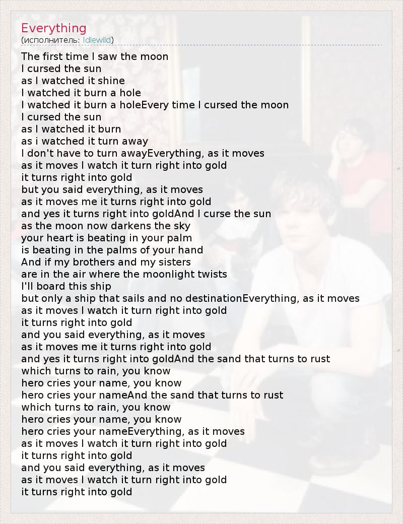 The first time I saw the moon I cursed the sun as I watched it shine I watched it burn a hole I watched it burn a holeEvery time I cursed the moon I cursed the sun as I watched it burn as i watched it turn away I don't have to turn awayEverything, as it moves as it moves I watch it turn right into gold it turns right into gold but you said everything, as it moves as it moves me it turns right into gold and yes it turns right into goldAnd I curse the sun as the moon now darkens the sky your heart is beating in your palm is beating in the palms of your hand And if my brothers and my sisters are in the air where the moonlight twists I'll board this ship but only a ship that sails and no destinationEverything, as it moves as it moves I watch it turn right into gold it turns right into gold and you said everything, as it moves as it moves me it turns right into gold and yes it turns right into goldAnd the sand that turns to rust which turns to rain, you know hero cries your name, you know hero cries your nameAnd the sand that turns to rust which turns to rain, you know hero cries your name, you know hero cries your nameEverything, as it moves as it moves I watch it turn right into gold it turns right into gold and you said everything, as it moves as it moves I watch it turn right into gold it turns right into gold