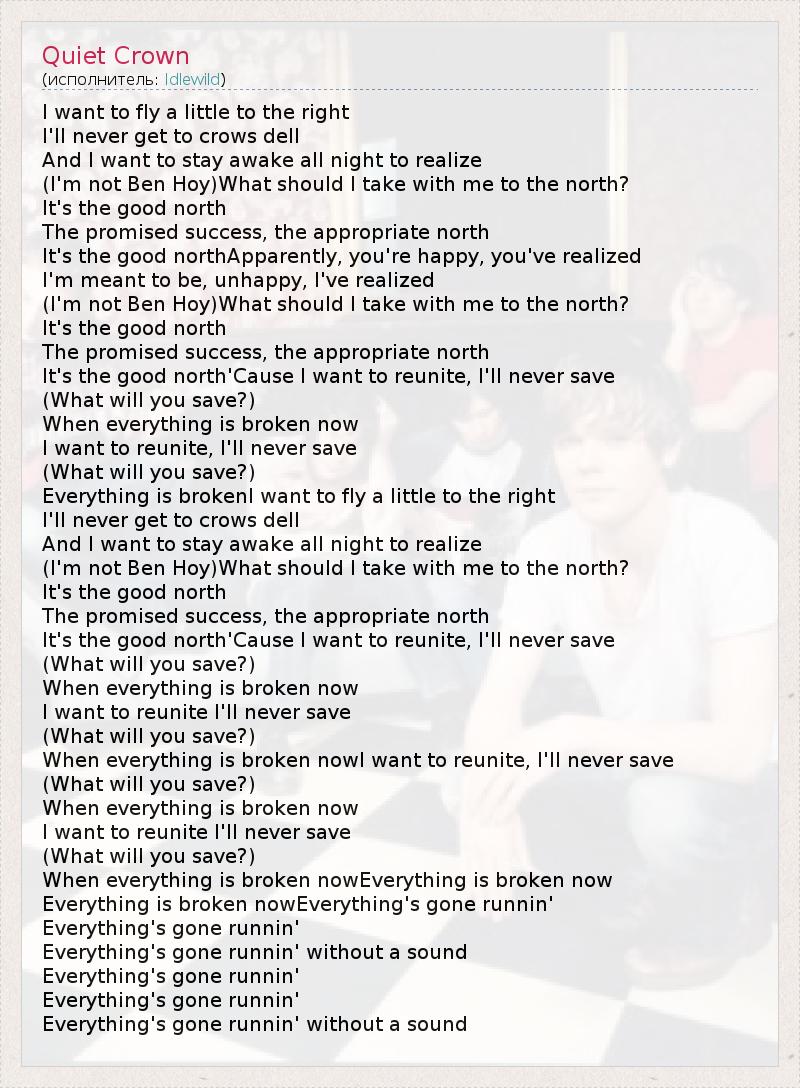 I want to fly a little to the right I'll never get to crows dell And I want to stay awake all night to realize (I'm not Ben Hoy)What should I take with me to the north? It's the good north The promised success, the appropriate north It's the good northApparently, you're happy, you've realized I'm meant to be, unhappy, I've realized (I'm not Ben Hoy)What should I take with me to the north? It's the good north The promised success, the appropriate north It's the good north'Cause I want to reunite, I'll never save (What will you save?) When everything is broken now I want to reunite, I'll never save (What will you save?) Everything is brokenI want to fly a little to the right I'll never get to crows dell And I want to stay awake all night to realize (I'm not Ben Hoy)What should I take with me to the north? It's the good north The promised success, the appropriate north It's the good north'Cause I want to reunite, I'll never save (What will you save?) When everything is broken now I want to reunite I'll never save (What will you save?) When everything is broken nowI want to reunite, I'll never save (What will you save?) When everything is broken now I want to reunite I'll never save (What will you save?) When everything is broken nowEverything is broken now Everything is broken nowEverything's gone runnin' Everything's gone runnin' Everything's gone runnin' without a sound Everything's gone runnin' Everything's gone runnin' Everything's gone runnin' without a sound