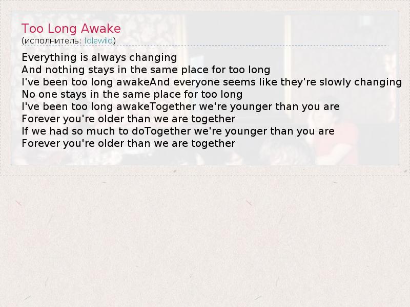 А как ты думаешь, о чем песня "Too Long Awake" ?