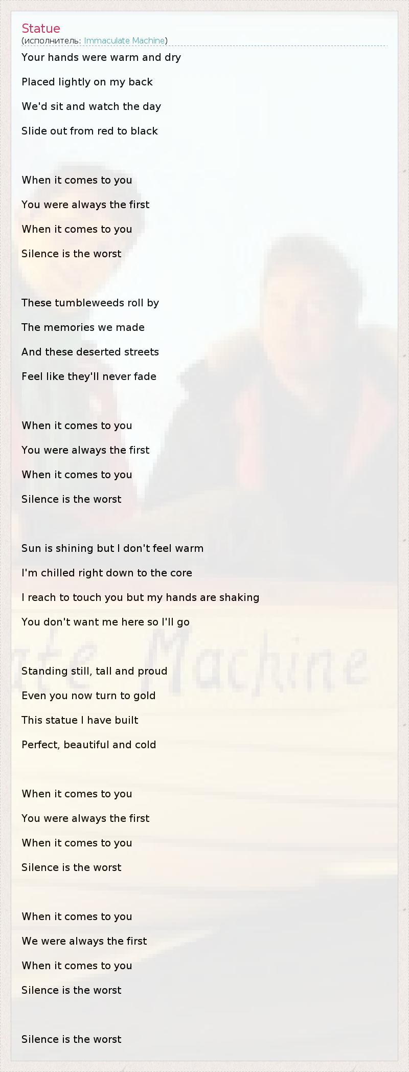 Your hands were warm and dry Placed lightly on my back We'd sit and watch the day Slide out from red to black When it comes to you You were always the first When it comes to you Silence is the worst These tumbleweeds roll by The memories we made And these deserted streets Feel like they'll never fade When it comes to you You were always the first When it comes to you Silence is the worst Sun is shining but I don't feel warm I'm chilled right down to the core I reach to touch you but my hands are shaking You don't want me here so I'll go Standing still, tall and proud Even you now turn to gold This statue I have built Perfect, beautiful and cold When it comes to you You were always the first When it comes to you Silence is the worst When it comes to you We were always the first When it comes to you Silence is the worst Silence is the worst