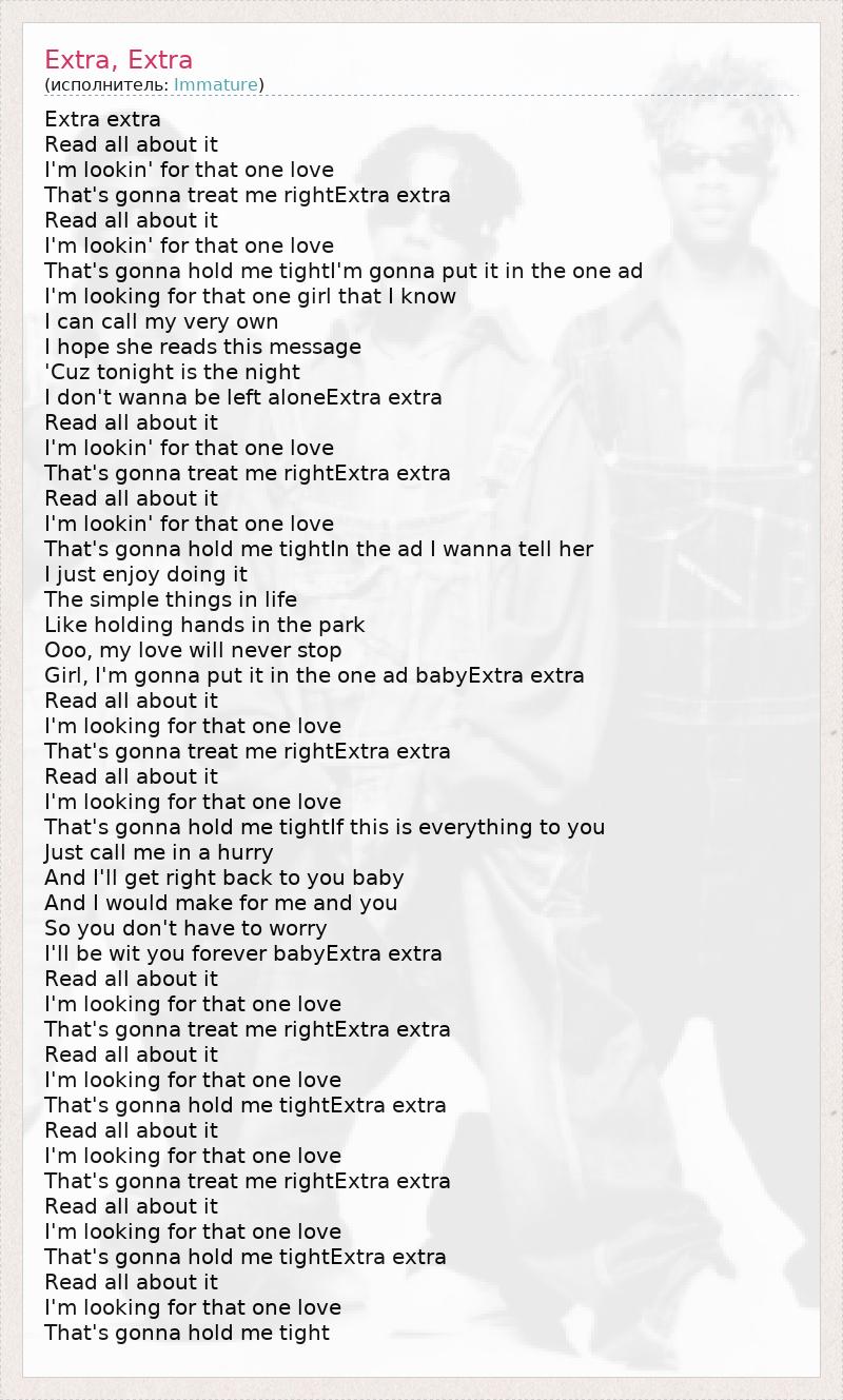 Extra extra Read all about it I'm lookin' for that one love That's gonna treat me rightExtra extra Read all about it I'm lookin' for that one love That's gonna hold me tightI'm gonna put it in the one ad I'm looking for that one girl that I know I can call my very own I hope she reads this message 'Cuz tonight is the night I don't wanna be left aloneExtra extra Read all about it I'm lookin' for that one love That's gonna treat me rightExtra extra Read all about it I'm lookin' for that one love That's gonna hold me tightIn the ad I wanna tell her I just enjoy doing it The simple things in life Like holding hands in the park Ooo, my love will never stop Girl, I'm gonna put it in the one ad babyExtra extra Read all about it I'm looking for that one love That's gonna treat me rightExtra extra Read all about it I'm looking for that one love That's gonna hold me tightIf this is everything to you Just call me in a hurry And I'll get right back to you baby And I would make for me and you So you don't have to worry I'll be wit you forever babyExtra extra Read all about it I'm looking for that one love That's gonna treat me rightExtra extra Read all about it I'm looking for that one love That's gonna hold me tightExtra extra Read all about it I'm looking for that one love That's gonna treat me rightExtra extra Read all about it I'm looking for that one love That's gonna hold me tightExtra extra Read all about it I'm looking for that one love That's gonna hold me tight