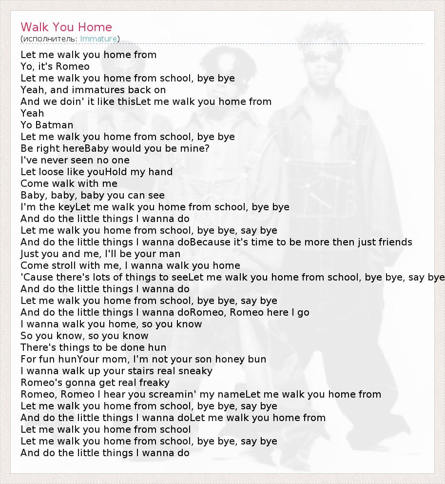 Let me walk you home from Yo, it's Romeo Let me walk you home from school, bye bye Yeah, and immatures back on And we doin' it like thisLet me walk you home from Yeah Yo Batman Let me walk you home from school, bye bye Be right hereBaby would you be mine? I've never seen no one Let loose like youHold my hand Come walk with me Baby, baby, baby you can see I'm the keyLet me walk you home from school, bye bye And do the little things I wanna do Let me walk you home from school, bye bye, say bye And do the little things I wanna doBecause it's time to be more then just friends Just you and me, I'll be your man Come stroll with me, I wanna walk you home 'Cause there's lots of things to seeLet me walk you home from school, bye bye, say bye And do the little things I wanna do Let me walk you home from school, bye bye, say bye And do the little things I wanna doRomeo, Romeo here I go I wanna walk you home, so you know So you know, so you know There's things to be done hun For fun hunYour mom, I'm not your son honey bun I wanna walk up your stairs real sneaky Romeo's gonna get real freaky Romeo, Romeo I hear you screamin' my nameLet me walk you home from Let me walk you home from school, bye bye, say bye And do the little things I wanna doLet me walk you home from Let me walk you home from school Let me walk you home from school, bye bye, say bye And do the little things I wanna do