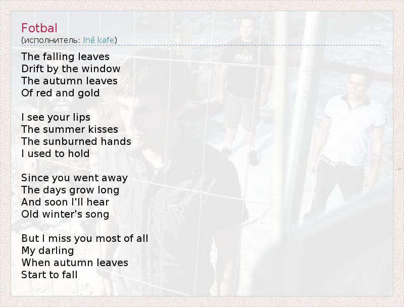 Падающие листья Скользят за окном. Осенние листья Красные и золотые. Я вижу твои губы, Летние поцелуи, Загорелые руки, Которые я держал когда-то. С тех пор как ты ушла, Дни стали дольше, И я скоро услышу Старую песню зимы. Но больше всего я стал скучать по тебе, Моя дорогая, Когда осенние листья Начали падать.