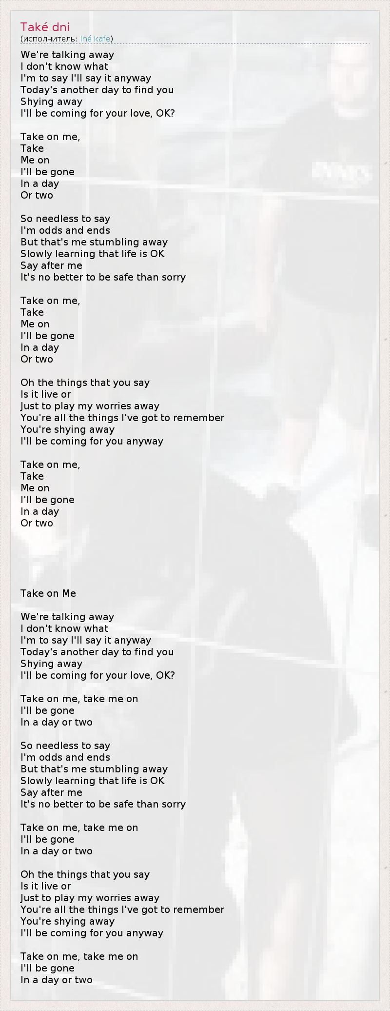 We're talking away I don't know what I'm to say I'll say it anyway Today's another day to find you Shying away I'll be coming for your love, OK? Take on me, Take Me on I'll be gone In a day Or two So needless to say I'm odds and ends But that's me stumbling away Slowly learning that life is OK Say after me It's no better to be safe than sorry Take on me, Take Me on I'll be gone In a day Or two Oh the things that you say Is it live or Just to play my worries away You're all the things I've got to remember You're shying away I'll be coming for you anyway Take on me, Take Me on I'll be gone In a day Or two Take on Me We're talking away I don't know what I'm to say I'll say it anyway Today's another day to find you Shying away I'll be coming for your love, OK? Take on me, take me on I'll be gone In a day or two So needless to say I'm odds and ends But that's me stumbling away Slowly learning that life is OK Say after me It's no better to be safe than sorry Take on me, take me on I'll be gone In a day or two Oh the things that you say Is it live or Just to play my worries away You're all the things I've got to remember You're shying away I'll be coming for you anyway Take on me, take me on I'll be gone In a day or two