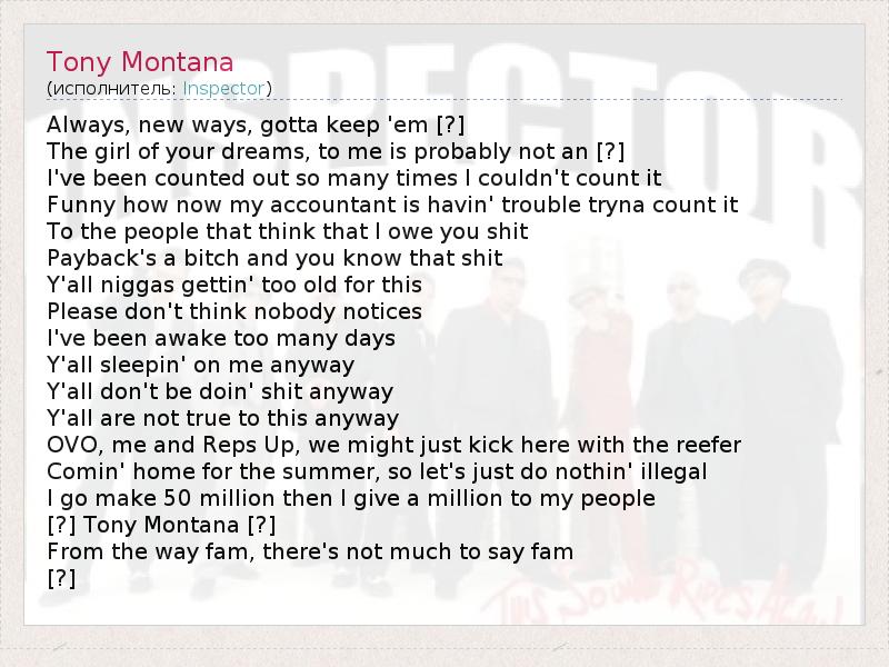 А как ты думаешь, о чем песня "Tony Montana" ?