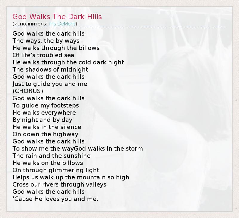 God walks the dark hills The ways, the by ways He walks through the billows Of life's troubled sea He walks through the cold dark night The shadows of midnight God walks the dark hills Just to guide you and me (CHORUS) God walks the dark hills To guide my footsteps He walks everywhere By night and by day He walks in the silence On down the highway God walks the dark hills To show me the wayGod walks in the storm The rain and the sunshine He walks on the billows On through glimmering light Helps us walk up the mountain so high Cross our rivers through valleys God walks the dark hills 'Cause He loves you and me.