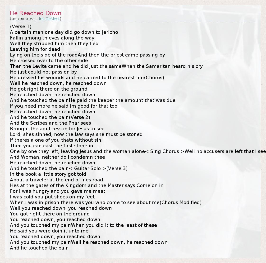 (Verse 1) A certain man one day did go down to Jericho Fallin among thieves along the way Well they stripped him then they fled Leaving him for dead Lying on the side of the roadAnd then the priest came passing by He crossed over to the other side Then the Levite came and he did just the sameWhen the Samaritan heard his cry He just could not pass on by He dressed his wounds and he carried to the nearest inn(Chorus) Well he reached down, he reached down He got right there on the ground He reached down, he reached down And he touched the painHe paid the keeper the amount that was due If you need more he said Im good for that too He reached down, he reached down And he touched the pain(Verse 2) And the Scribes and the Pharisees Brought the adultress in for Jesus to see Lord, shes sinned, now the law says she must be stoned If theres a one of you thats without sin Then you can cast the first stone in One by one they left, leaving Jesus and the woman alone< Sing Chorus >Well no accusers are left that I see And Woman, neither do I condemn thee He reached down, he reached down And he touched the pain< Guitar Solo >(Verse 3) In the book a little story got told About a traveler at the end of lifes road Hes at the gates of the Kingdom and the Master says Come on in For I was hungry and you gave me meat I was cold you put shoes on my feet When I was in prison there was you who come to see about me(Chorus Modified) Well you reached down, you reached down You got right there on the ground You reached down, you reached down And you touched my painWhen you did it to the least of these He said you were doin it unto me You reached down, you reached down And you touched my painWell he reached down, he reached down And he touched the pain