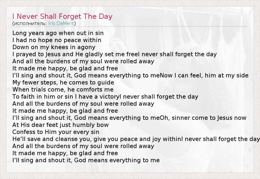 Long years ago when out in sin I had no hope no peace within Down on my knees in agony I prayed to Jesus and He gladly set me freeI never shall forget the day And all the burdens of my soul were rolled away It made me happy, be glad and free I'll sing and shout it, God means everything to meNow I can feel, him at my side My fewer steps, he comes to guide When trials come, he comforts me To faith in him or sin I have a victoryI never shall forget the day And all the burdens of my soul were rolled away It made me happy, be glad and free I'll sing and shout it, God means everything to meOh, sinner come to Jesus now At His dear feet just humbly bow Confess to Him your every sin He'll save and cleanse you, give you peace and joy withinI never shall forget the day And all the burdens of my soul were rolled away It made me happy, be glad and free I'll sing and shout it, God means everything to me