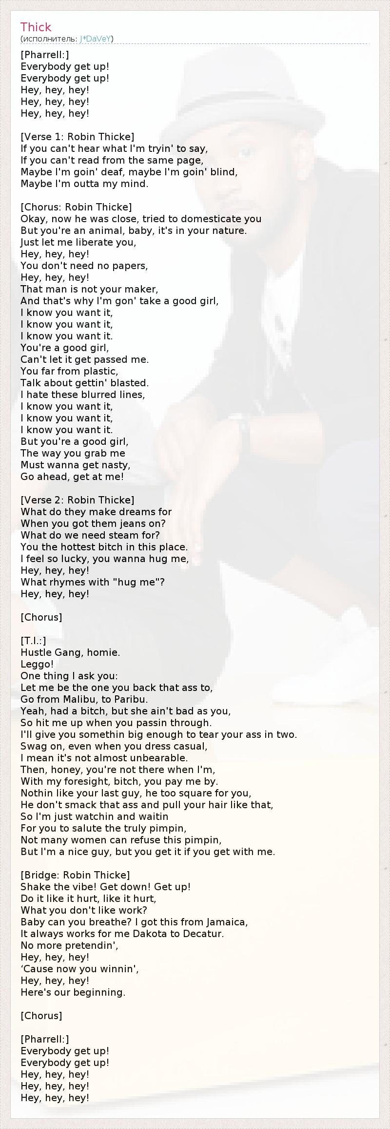 [Pharrell:] Ну-ка встали все! Ну-ка встали все! Эй-эй-эй! Эй-эй-эй! Эй-эй-эй! [Куплет 1: Robin Thicke] Если ты не слышишь, что я пытаюсь сказать, И если ты не можешь прочесть с той же страницы, То я, наверное, глохну, то я, наверное, слепну, То я, наверное, схожу с ума. [Припев: Robin Thicke] Да-да, он был рядом и пытался приручить тебя, Но ты дикий зверь, милая, это в твоём естестве. Разреши мне освободить тебя, Эй-эй-эй! И не нужно денег, Эй-эй-эй! Тот парень не твой создатель, Поэтому-то я и заберу с собой хорошую девочку, Я же знаю: ты хочешь, Я же знаю: ты хочешь, Я же знаю: ты хочешь. Ты хорошая девочка, Я не могу отпустить тебя. Ты отнюдь не целлулоидная кукла, Поговорим о том, как бы развлечься. Ненавижу невнятные отношения, 1 Но я знаю, что ты хочешь именно их, Я знаю: ты хочешь их, Я знаю: ты хочешь их. Ты хорошая девочка, Но, судя по тому, как ты липнешь ко мне, Ты хочешь побыть плохой, Ну так, давай, иди ко мне! [Куплет 2: Robin Thicke] Какие же появляются мысли у остальных, Когда ты надеваешь эти джинсы? Зачем нам выпускать пар, Если здесь ты самая горячая с**ка? Мне так повезло: ты хочешь обниматься, Эй-эй-эй! Только без "ним", и "о" можно заменить... Эй-эй-эй! [Припев] [T.I.:] Банда Хасл, 2 братан. Вперёд! Я прошу тебя об одном: Пусть я буду тем, для кого ты раздвигаешь булки, От Малибу до Парижа, милочка. Да, у меня уже есть ш**ха, но ей до тебя далеко, Так что будешь рядом – звони. У меня есть то, что порвёт тебе ж**у. Ты носишь кучу цацок даже с повседневным платьем, Ну, в принципе, не так уж плохо. Милая, ты не на моём уровне, Но я предусмотрителен: ты со мной ещё рассчитаешься. Я полная противоположность твоему бывшему: он был недостоин тебя, Он не шлёпал тебя по по**е и не таскал тебя за волосы, Я просто стою и жду, Кода ты отдашь моей крутизне должное, Немногим женщинам это по силам, Я клёвый парень, но не пойми неправильно: с тобой я могу всё. [Переход: Robin Thicke] Поймай волну! Опустись! И снова встань! Делай это так, будто тебе больно, будто тебе больно, Неужели тебе это не нравится? Детка, ты ещё дышишь? Это травка с Ямайки, На меня действует безотказно: от Дакоты до Декатура. Не надо притворяться, Эй-эй-эй! Ты берешь верх, Эй-эй-эй! Для нас это начало. [Припев] [Pharrell:] Ну-ка встали все! Ну-ка встали все! Эй-эй-эй! Эй-эй-эй! Эй-эй-эй! 1 – Дословно: размытые контуры. 2 – Grand Hustle Records – звукозаписывающий лейбл, дочернее подразделение Atlantic Records Group; основан T.I. в 2003 году.