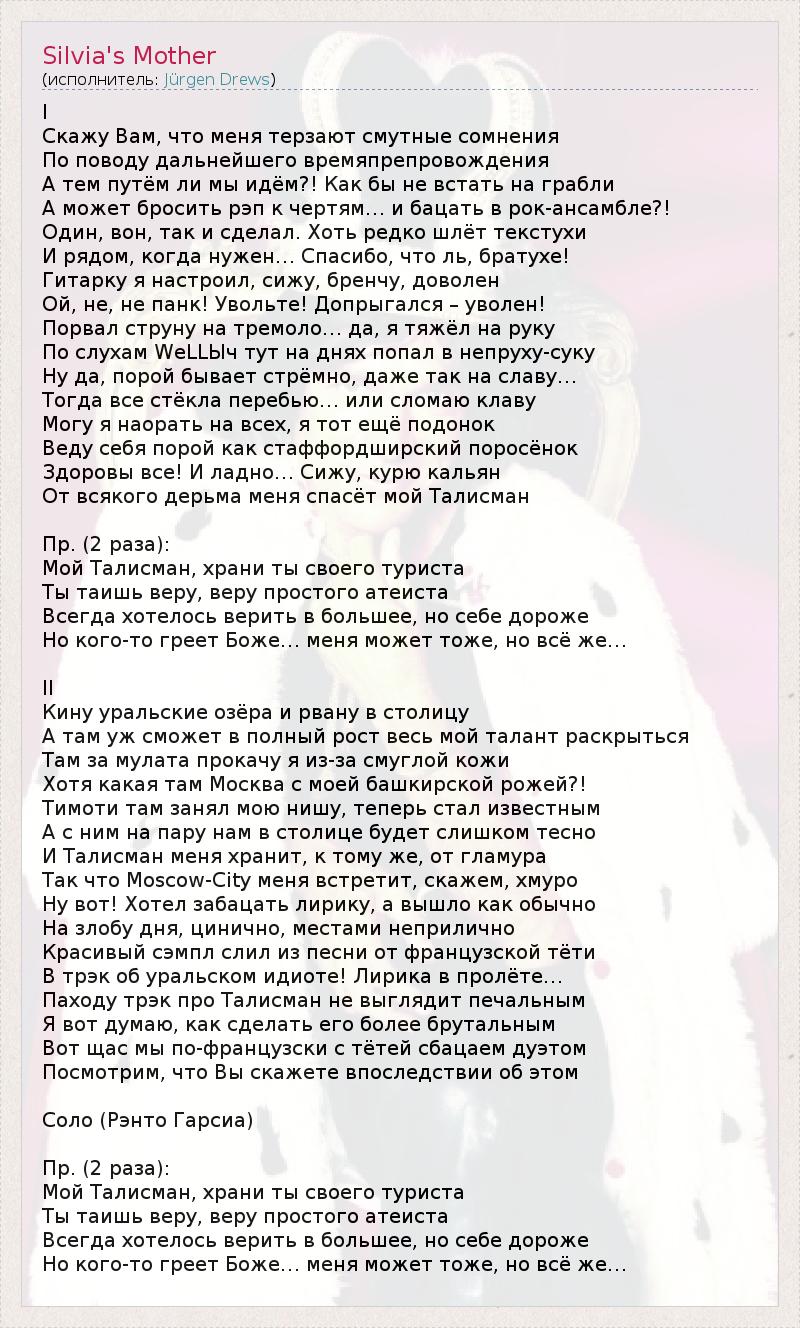 I I will tell you that I was plagued by vague doubts Regarding further pastime And the way we're going ?! It would not stand up on a rake Or throw a rap to hell ... and batsat in rock ensemble ?! One out, so did he. Though rarely sends tekstuhi And there when needed ... Thank you, eh, bratuha! Gitarku I adjusted, sit strumming, happy Oh, no, not a punk! Thank you! Doprygat - fired! Broken string on tremolo ... yeah, I is heavy on the hand Rumor WeLLYch here the other day was in nepruha-bitch Well, yes, sometimes it's dumb, so even the glory ... Then all the windows, or break interrupt ... Claudia Can I scream at all, I'm the scum More Sometimes behave like a pig Staffordshire Health is! And well ... I sit, smoke hookah From shit I save my Talisman Pr. (2 times): My Talisman, you keep your tourist You taish faith, the faith of a simple atheist Always I wanted to believe more, but a more expensive But someone warms God ... I can too, but still ... II Keanu Ural lakes and ripped the capital And there will in full growth all my talent to reveal There mulatto for a ride because I have dark skin Although there are some of my Moscow Bashkir mug ?! Timothy took my niche there, we now know And with him on a couple of our capital will be too crowded And I Talisman keeps, moreover, from glamor So Moscow-City meet me, say, frowning Here you go! I wanted zabatsat lyrics, but it turned out as usual On the topic of the day, cynical, sometimes obscenely The beautiful sample of the song leaked to the French aunt The track of the Urals idiot! Lyrics in flight ... Pahodu track about Talisman does not look sad I wonder how to make it more brutal Here we are right now in French and aunt sbatsat duet Let's see what you say about it later Solo (Rant Garcia) Pr. (2 times): My Talisman, you keep your tourist You taish faith, the faith of a simple atheist Always I wanted to believe more, but a more expensive But someone warms God ... I can too, but still ...