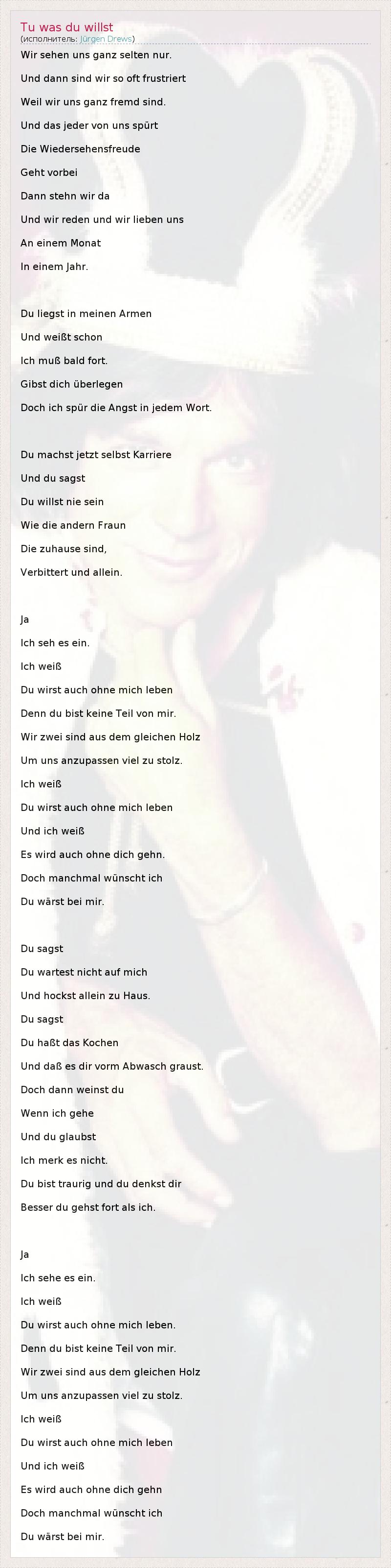 Wir sehen uns ganz selten nur. Und dann sind wir so oft frustriert Weil wir uns ganz fremd sind. Und das jeder von uns spürt Die Wiedersehensfreude Geht vorbei Dann stehn wir da Und wir reden und wir lieben uns An einem Monat In einem Jahr. Du liegst in meinen Armen Und weißt schon Ich muß bald fort. Gibst dich überlegen Doch ich spür die Angst in jedem Wort. Du machst jetzt selbst Karriere Und du sagst Du willst nie sein Wie die andern Fraun Die zuhause sind, Verbittert und allein. Ja Ich seh es ein. Ich weiß Du wirst auch ohne mich leben Denn du bist keine Teil von mir. Wir zwei sind aus dem gleichen Holz Um uns anzupassen viel zu stolz. Ich weiß Du wirst auch ohne mich leben Und ich weiß Es wird auch ohne dich gehn. Doch manchmal wünscht ich Du wärst bei mir. Du sagst Du wartest nicht auf mich Und hockst allein zu Haus. Du sagst Du haßt das Kochen Und daß es dir vorm Abwasch graust. Doch dann weinst du Wenn ich gehe Und du glaubst Ich merk es nicht. Du bist traurig und du denkst dir Besser du gehst fort als ich. Ja Ich sehe es ein. Ich weiß Du wirst auch ohne mich leben. Denn du bist keine Teil von mir. Wir zwei sind aus dem gleichen Holz Um uns anzupassen viel zu stolz. Ich weiß Du wirst auch ohne mich leben Und ich weiß Es wird auch ohne dich gehn Doch manchmal wünscht ich Du wärst bei mir.