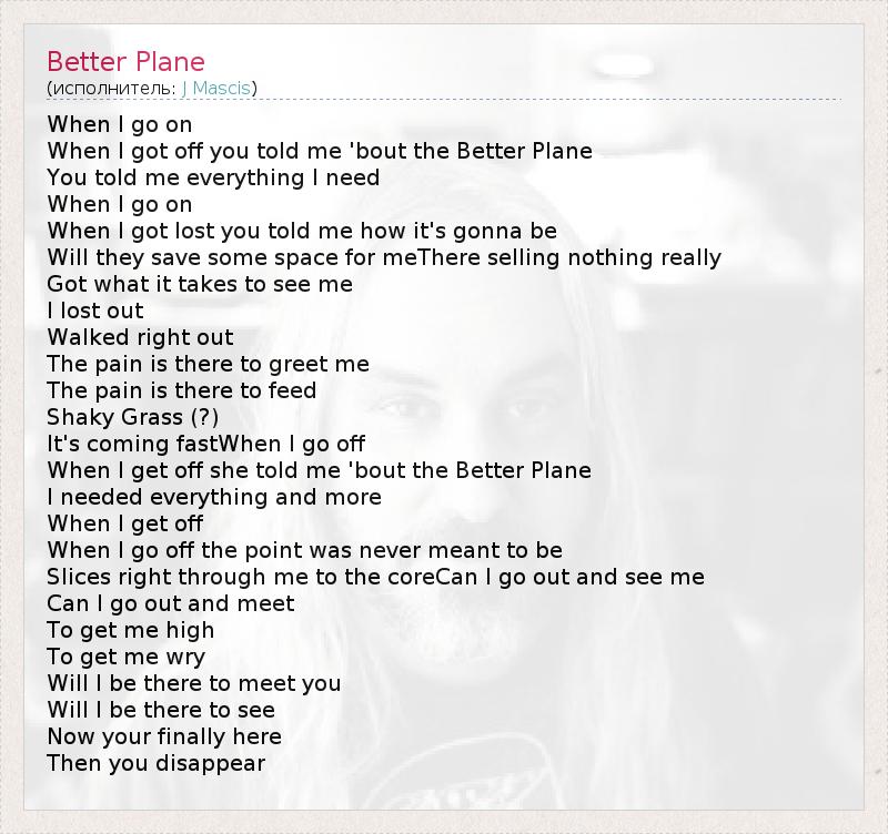 When I go on When I got off you told me 'bout the Better Plane You told me everything I need When I go on When I got lost you told me how it's gonna be Will they save some space for meThere selling nothing really Got what it takes to see me I lost out Walked right out The pain is there to greet me The pain is there to feed Shaky Grass (?) It's coming fastWhen I go off When I get off she told me 'bout the Better Plane I needed everything and more When I get off When I go off the point was never meant to be Slices right through me to the coreCan I go out and see me Can I go out and meet To get me high To get me wry Will I be there to meet you Will I be there to see Now your finally here Then you disappear