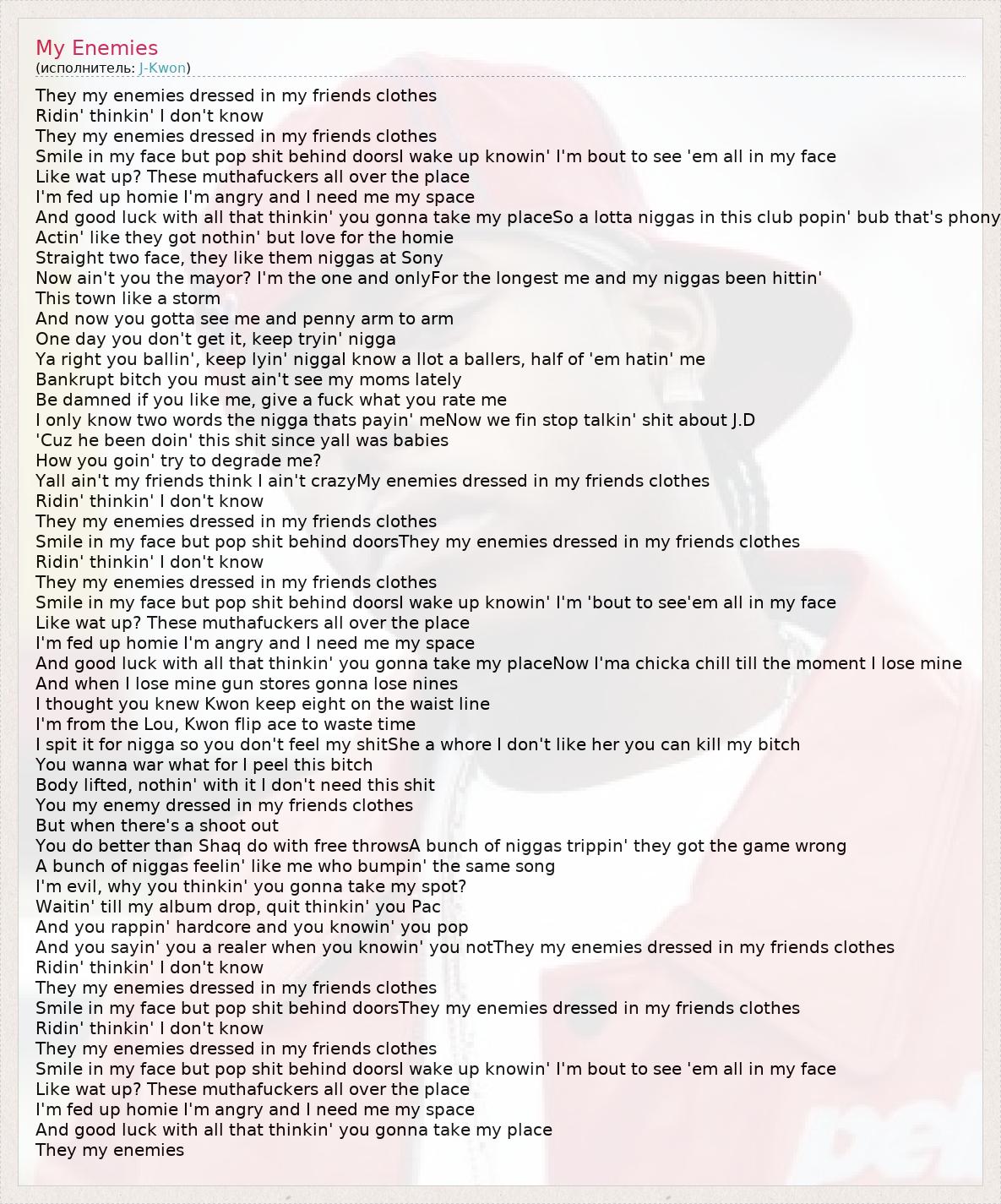 They my enemies dressed in my friends clothes Ridin' thinkin' I don't know They my enemies dressed in my friends clothes Smile in my face but pop shit behind doorsI wake up knowin' I'm bout to see 'em all in my face Like wat up? These muthafuckers all over the place I'm fed up homie I'm angry and I need me my space And good luck with all that thinkin' you gonna take my placeSo a lotta niggas in this club popin' bub that's phony Actin' like they got nothin' but love for the homie Straight two face, they like them niggas at Sony Now ain't you the mayor? I'm the one and onlyFor the longest me and my niggas been hittin' This town like a storm And now you gotta see me and penny arm to arm One day you don't get it, keep tryin' nigga Ya right you ballin', keep lyin' niggaI know a llot a ballers, half of 'em hatin' me Bankrupt bitch you must ain't see my moms lately Be damned if you like me, give a fuck what you rate me I only know two words the nigga thats payin' meNow we fin stop talkin' shit about J.D 'Cuz he been doin' this shit since yall was babies How you goin' try to degrade me? Yall ain't my friends think I ain't crazyMy enemies dressed in my friends clothes Ridin' thinkin' I don't know They my enemies dressed in my friends clothes Smile in my face but pop shit behind doorsThey my enemies dressed in my friends clothes Ridin' thinkin' I don't know They my enemies dressed in my friends clothes Smile in my face but pop shit behind doorsI wake up knowin' I'm 'bout to see'em all in my face Like wat up? These muthafuckers all over the place I'm fed up homie I'm angry and I need me my space And good luck with all that thinkin' you gonna take my placeNow I'ma chicka chill till the moment I lose mine And when I lose mine gun stores gonna lose nines I thought you knew Kwon keep eight on the waist line I'm from the Lou, Kwon flip ace to waste time I spit it for nigga so you don't feel my shitShe a whore I don't like her you can kill my bitch You wanna war what for I peel this bitch Body lifted, nothin' with it I don't need this shit You my enemy dressed in my friends clothes But when there's a shoot out You do better than Shaq do with free throwsA bunch of niggas trippin' they got the game wrong A bunch of niggas feelin' like me who bumpin' the same song I'm evil, why you thinkin' you gonna take my spot? Waitin' till my album drop, quit thinkin' you Pac And you rappin' hardcore and you knowin' you pop And you sayin' you a realer when you knowin' you notThey my enemies dressed in my friends clothes Ridin' thinkin' I don't know They my enemies dressed in my friends clothes Smile in my face but pop shit behind doorsThey my enemies dressed in my friends clothes Ridin' thinkin' I don't know They my enemies dressed in my friends clothes Smile in my face but pop shit behind doorsI wake up knowin' I'm bout to see 'em all in my face Like wat up? These muthafuckers all over the place I'm fed up homie I'm angry and I need me my space And good luck with all that thinkin' you gonna take my place They my enemies