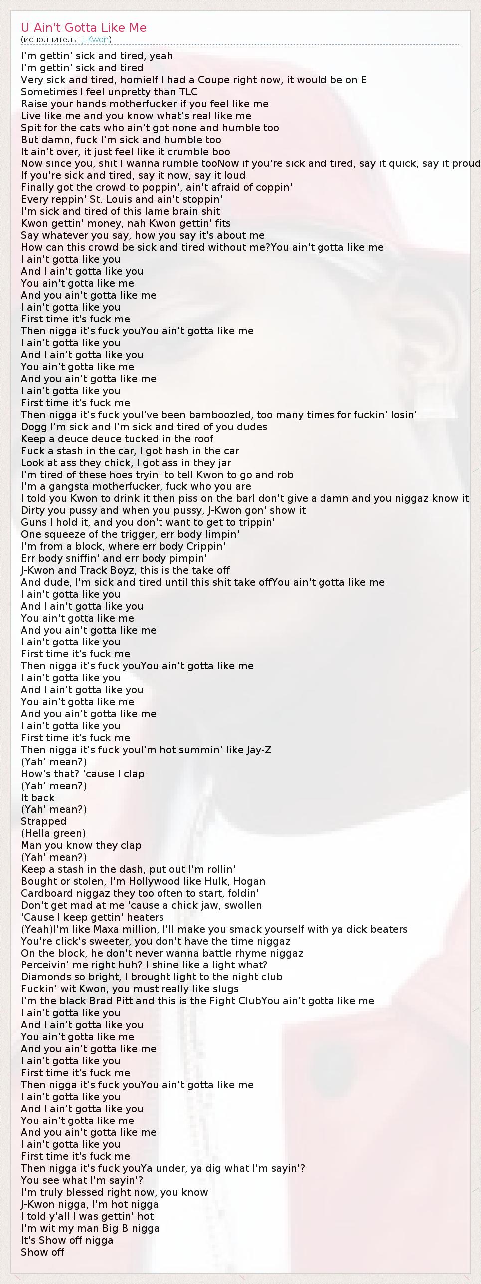I'm gettin' sick and tired, yeah I'm gettin' sick and tired Very sick and tired, homieIf I had a Coupe right now, it would be on E Sometimes I feel unpretty than TLC Raise your hands motherfucker if you feel like me Live like me and you know what's real like me Spit for the cats who ain't got none and humble too But damn, fuck I'm sick and humble too It ain't over, it just feel like it crumble boo Now since you, shit I wanna rumble tooNow if you're sick and tired, say it quick, say it proud If you're sick and tired, say it now, say it loud Finally got the crowd to poppin', ain't afraid of coppin' Every reppin' St. Louis and ain't stoppin' I'm sick and tired of this lame brain shit Kwon gettin' money, nah Kwon gettin' fits Say whatever you say, how you say it's about me How can this crowd be sick and tired without me?You ain't gotta like me I ain't gotta like you And I ain't gotta like you You ain't gotta like me And you ain't gotta like me I ain't gotta like you First time it's fuck me Then nigga it's fuck youYou ain't gotta like me I ain't gotta like you And I ain't gotta like you You ain't gotta like me And you ain't gotta like me I ain't gotta like you First time it's fuck me Then nigga it's fuck youI've been bamboozled, too many times for fuckin' losin' Dogg I'm sick and I'm sick and tired of you dudes Keep a deuce deuce tucked in the roof Fuck a stash in the car, I got hash in the car Look at ass they chick, I got ass in they jar I'm tired of these hoes tryin' to tell Kwon to go and rob I'm a gangsta motherfucker, fuck who you are I told you Kwon to drink it then piss on the barI don't give a damn and you niggaz know it Dirty you pussy and when you pussy, J-Kwon gon' show it Guns I hold it, and you don't want to get to trippin' One squeeze of the trigger, err body limpin' I'm from a block, where err body Crippin' Err body sniffin' and err body pimpin' J-Kwon and Track Boyz, this is the take off And dude, I'm sick and tired until this shit take offYou ain't gotta like me I ain't gotta like you And I ain't gotta like you You ain't gotta like me And you ain't gotta like me I ain't gotta like you First time it's fuck me Then nigga it's fuck youYou ain't gotta like me I ain't gotta like you And I ain't gotta like you You ain't gotta like me And you ain't gotta like me I ain't gotta like you First time it's fuck me Then nigga it's fuck youI'm hot summin' like Jay-Z (Yah' mean?) How's that? 'cause I clap (Yah' mean?) It back (Yah' mean?) Strapped (Hella green) Man you know they clap (Yah' mean?) Keep a stash in the dash, put out I'm rollin' Bought or stolen, I'm Hollywood like Hulk, Hogan Cardboard niggaz they too often to start, foldin' Don't get mad at me 'cause a chick jaw, swollen 'Cause I keep gettin' heaters (Yeah)I'm like Maxa million, I'll make you smack yourself with ya dick beaters You're click's sweeter, you don't have the time niggaz On the block, he don't never wanna battle rhyme niggaz Perceivin' me right huh? I shine like a light what? Diamonds so bright, I brought light to the night club Fuckin' wit Kwon, you must really like slugs I'm the black Brad Pitt and this is the Fight ClubYou ain't gotta like me I ain't gotta like you And I ain't gotta like you You ain't gotta like me And you ain't gotta like me I ain't gotta like you First time it's fuck me Then nigga it's fuck youYou ain't gotta like me I ain't gotta like you And I ain't gotta like you You ain't gotta like me And you ain't gotta like me I ain't gotta like you First time it's fuck me Then nigga it's fuck youYa under, ya dig what I'm sayin'? You see what I'm sayin'? I'm truly blessed right now, you know J-Kwon nigga, I'm hot nigga I told y'all I was gettin' hot I'm wit my man Big B nigga It's Show off nigga Show off