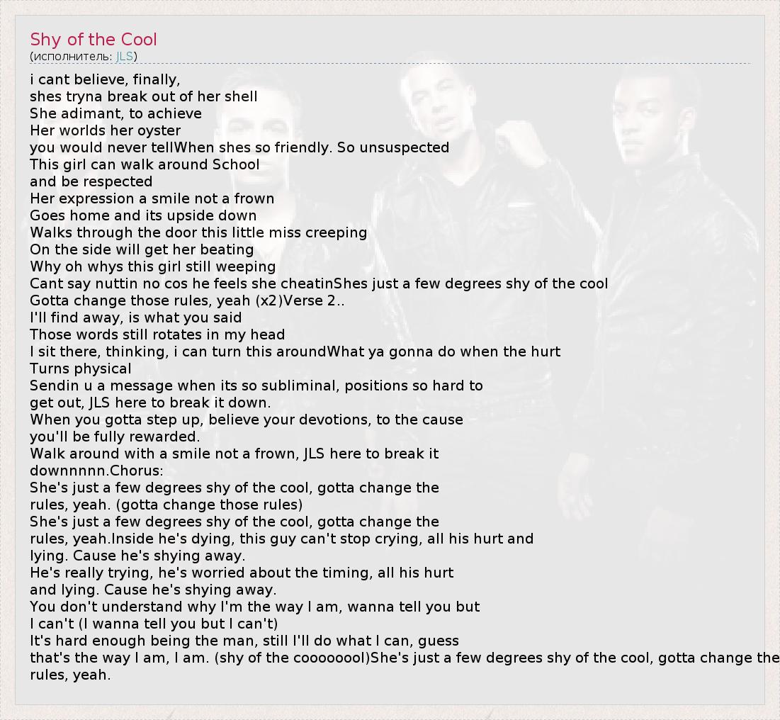 i cant believe, finally, shes tryna break out of her shell She adimant, to achieve Her worlds her oyster you would never tellWhen shes so friendly. So unsuspected This girl can walk around School and be respected Her expression a smile not a frown Goes home and its upside down Walks through the door this little miss creeping On the side will get her beating Why oh whys this girl still weeping Cant say nuttin no cos he feels she cheatinShes just a few degrees shy of the cool Gotta change those rules, yeah (x2)Verse 2.. I'll find away, is what you said Those words still rotates in my head I sit there, thinking, i can turn this aroundWhat ya gonna do when the hurt Turns physical Sendin u a message when its so subliminal, positions so hard to get out, JLS here to break it down. When you gotta step up, believe your devotions, to the cause you'll be fully rewarded. Walk around with a smile not a frown, JLS here to break it downnnnn.Chorus: She's just a few degrees shy of the cool, gotta change the rules, yeah. (gotta change those rules) She's just a few degrees shy of the cool, gotta change the rules, yeah.Inside he's dying, this guy can't stop crying, all his hurt and lying. Cause he's shying away. He's really trying, he's worried about the timing, all his hurt and lying. Cause he's shying away. You don't understand why I'm the way I am, wanna tell you but I can't (I wanna tell you but I can't) It's hard enough being the man, still I'll do what I can, guess that's the way I am, I am. (shy of the coooooool)She's just a few degrees shy of the cool, gotta change the rules, yeah.