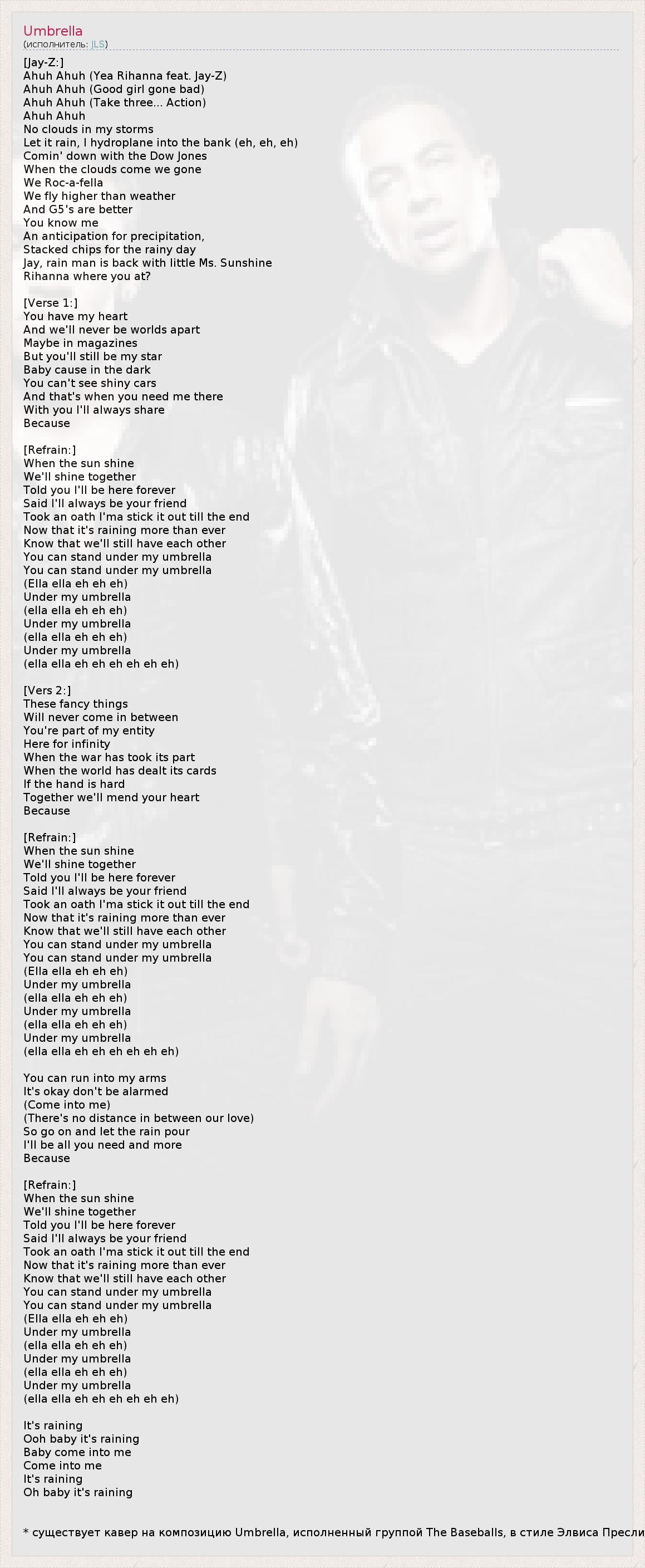 * существует кавер на композицию Umbrella, исполненный группой The Baseballs, в стиле Элвиса Пресли