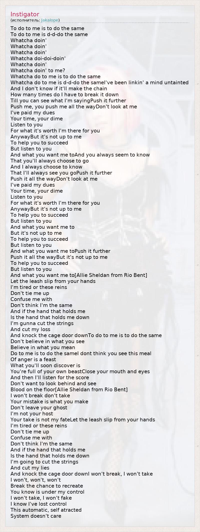 To do to me is to do the same To do to me is d-d-do the same Whatcha doin' Whatcha doin' Whatcha doin' Whatcha doi-doi-doin' Whatcha doin' Whatcha doin' to me? Whatcha do to me is to do the same Whatcha do to me is d-d-do the sameI've been linkin' a mind untainted And I don't know if it'll make the chain How many times do I have to break it down Till you can see what I'm sayingPush it further Push me, you push me all the wayDon't look at me I've paid my dues Your time, your dime Listen to you For what it's worth I'm there for you AnywayBut it's not up to me To help you to succeed But listen to you And what you want me toAnd you always seem to know That you'll always choose to go And I always choose to know That I'll always see you goPush it further Push it all the wayDon't look at me I've paid my dues Your time, your dime Listen to you For what it's worth I'm there for you AnywayBut it's not up to me To help you to succeed But listen to you And what you want me to But it's not up to me To help you to succeed But listen to you And what you want me toPush it further Push it all the wayBut it's not up to me To help you to succeed But listen to you And what you want me to[Allie Sheldan from Rio Bent] Let the leash slip from your hands I'm tired or these reins Don't tie me up Confuse me with Don't think I'm the same And if the hand that holds me Is the hand that holds me down I'm gunna cut the strings And cut my loss And knock the cage door downTo do to me is to do the same Don't believe in what you see Believe in what you mean Do to me is to do the sameI dont think you see this meal Of anger is a feast What you'll soon discover is You're full of your own beastClose your mouth and eyes And then I'll listen for the score Don't want to look behind and see Blood on the floor[Allie Sheldan from Rio Bent] I won't break don't take Your mistake is what you make Don't leave your ghost I'm not your host Your take is not my fateLet the leash slip from your hands I'm tired or these reins Don't tie me up Confuse me with Don't think I'm the same And if the hand that holds me Is the hand that holds me down I'm going to cut the strings And cut my lies And knock the cage door downI won't break, I won't take I won't, won't, won't Break the chance to recreate You know is under my control I won't take, I won't fake I know I've lost control This automatic, self atracted System doesn't care