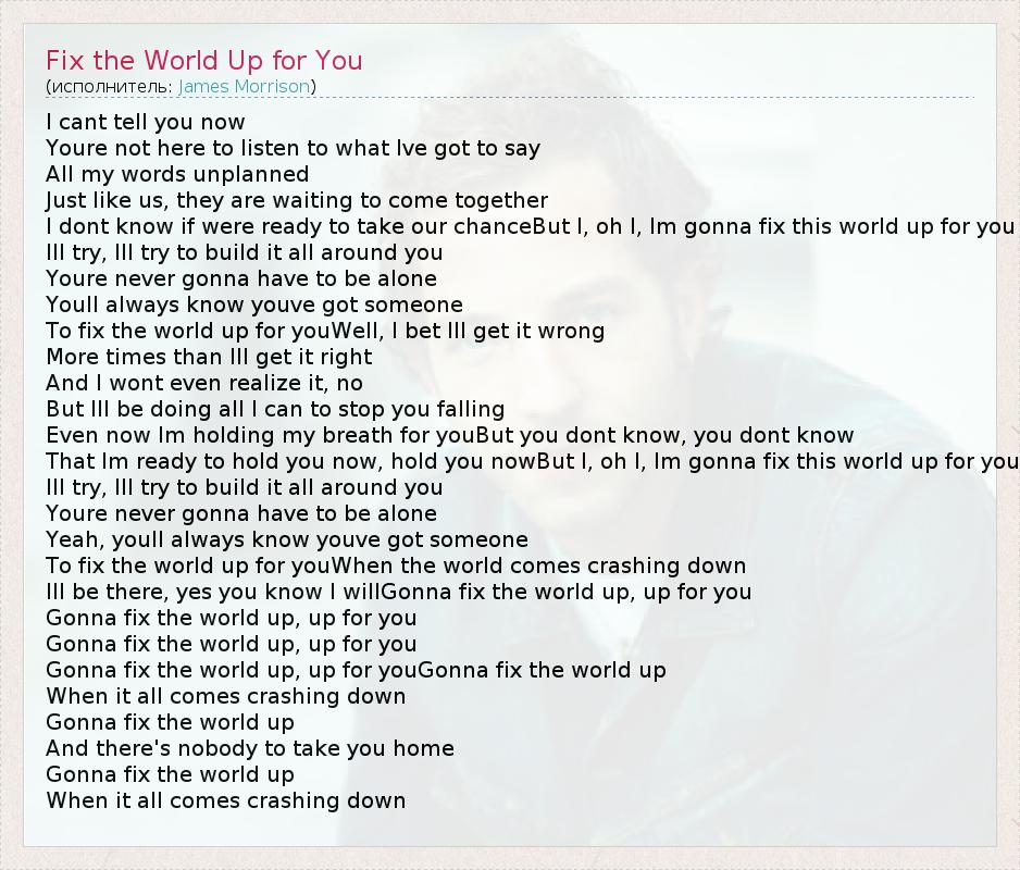 I cant tell you now Youre not here to listen to what Ive got to say All my words unplanned Just like us, they are waiting to come together I dont know if were ready to take our chanceBut I, oh I, Im gonna fix this world up for you Ill try, Ill try to build it all around you Youre never gonna have to be alone Youll always know youve got someone To fix the world up for youWell, I bet Ill get it wrong More times than Ill get it right And I wont even realize it, no But Ill be doing all I can to stop you falling Even now Im holding my breath for youBut you dont know, you dont know That Im ready to hold you now, hold you nowBut I, oh I, Im gonna fix this world up for you Ill try, Ill try to build it all around you Youre never gonna have to be alone Yeah, youll always know youve got someone To fix the world up for youWhen the world comes crashing down Ill be there, yes you know I willGonna fix the world up, up for you Gonna fix the world up, up for you Gonna fix the world up, up for you Gonna fix the world up, up for youGonna fix the world up When it all comes crashing down Gonna fix the world up And there's nobody to take you home Gonna fix the world up When it all comes crashing down