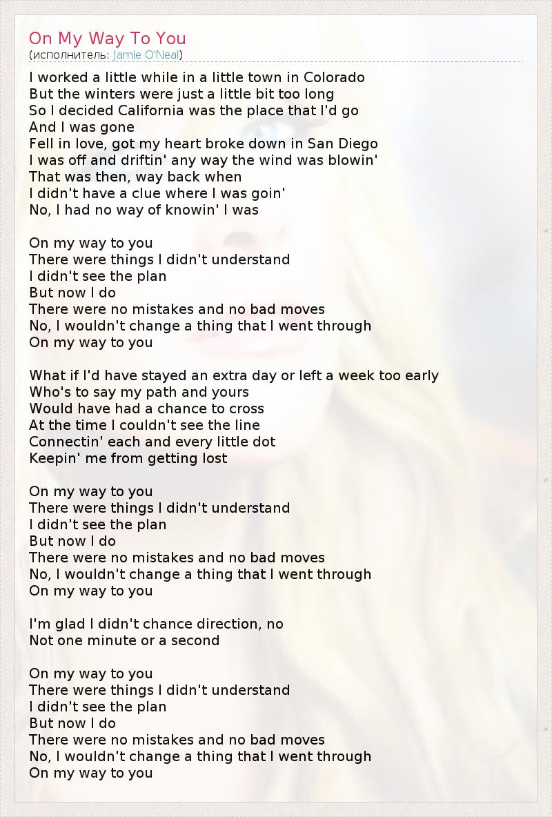 I worked a little while in a little town in Colorado But the winters were just a little bit too long So I decided California was the place that I'd go And I was gone Fell in love, got my heart broke down in San Diego I was off and driftin' any way the wind was blowin' That was then, way back when I didn't have a clue where I was goin' No, I had no way of knowin' I was On my way to you There were things I didn't understand I didn't see the plan But now I do There were no mistakes and no bad moves No, I wouldn't change a thing that I went through On my way to you What if I'd have stayed an extra day or left a week too early Who's to say my path and yours Would have had a chance to cross At the time I couldn't see the line Connectin' each and every little dot Keepin' me from getting lost On my way to you There were things I didn't understand I didn't see the plan But now I do There were no mistakes and no bad moves No, I wouldn't change a thing that I went through On my way to you I'm glad I didn't chance direction, no Not one minute or a second On my way to you There were things I didn't understand I didn't see the plan But now I do There were no mistakes and no bad moves No, I wouldn't change a thing that I went through On my way to you