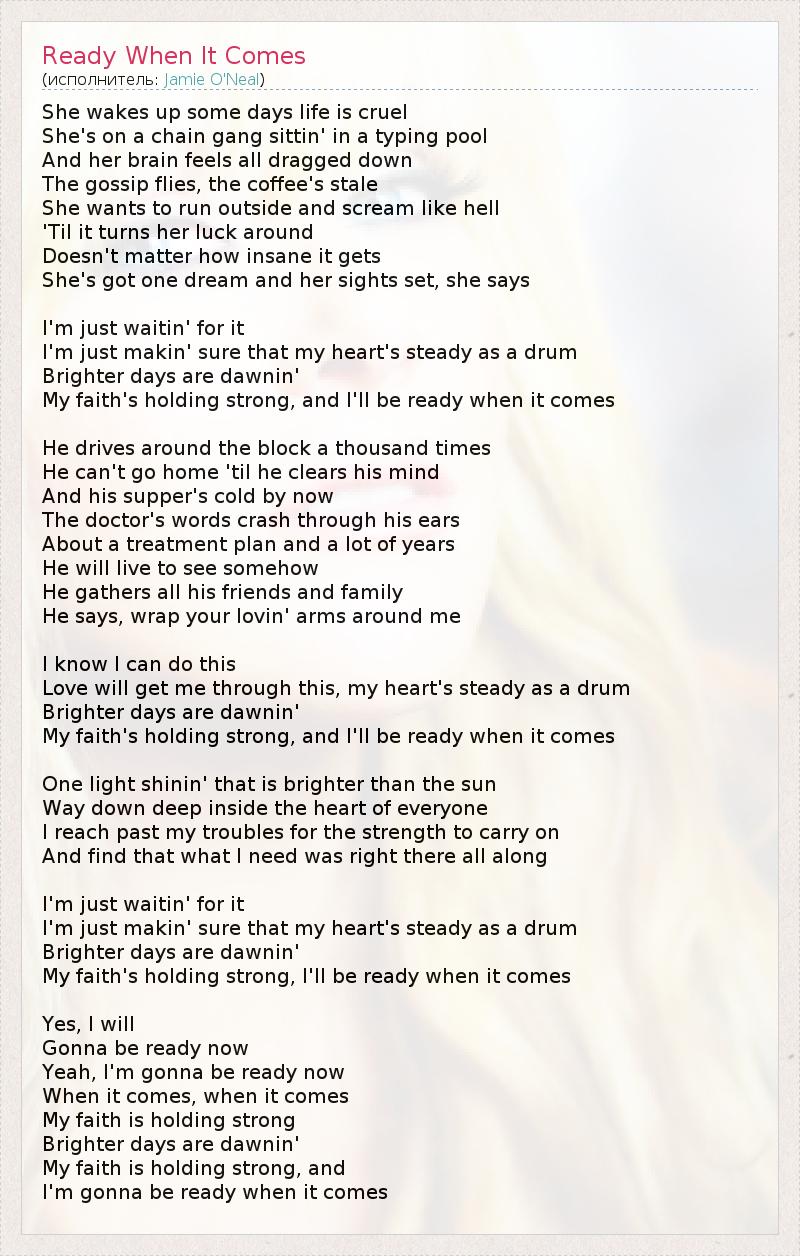 She wakes up some days life is cruel She's on a chain gang sittin' in a typing pool And her brain feels all dragged down The gossip flies, the coffee's stale She wants to run outside and scream like hell 'Til it turns her luck around Doesn't matter how insane it gets She's got one dream and her sights set, she says I'm just waitin' for it I'm just makin' sure that my heart's steady as a drum Brighter days are dawnin' My faith's holding strong, and I'll be ready when it comes He drives around the block a thousand times He can't go home 'til he clears his mind And his supper's cold by now The doctor's words crash through his ears About a treatment plan and a lot of years He will live to see somehow He gathers all his friends and family He says, wrap your lovin' arms around me I know I can do this Love will get me through this, my heart's steady as a drum Brighter days are dawnin' My faith's holding strong, and I'll be ready when it comes One light shinin' that is brighter than the sun Way down deep inside the heart of everyone I reach past my troubles for the strength to carry on And find that what I need was right there all along I'm just waitin' for it I'm just makin' sure that my heart's steady as a drum Brighter days are dawnin' My faith's holding strong, I'll be ready when it comes Yes, I will Gonna be ready now Yeah, I'm gonna be ready now When it comes, when it comes My faith is holding strong Brighter days are dawnin' My faith is holding strong, and I'm gonna be ready when it comes