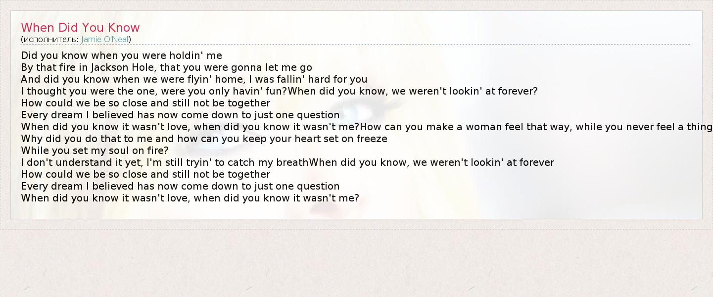 Did you know when you were holdin' me By that fire in Jackson Hole, that you were gonna let me go And did you know when we were flyin' home, I was fallin' hard for you I thought you were the one, were you only havin' fun?When did you know, we weren't lookin' at forever? How could we be so close and still not be together Every dream I believed has now come down to just one question When did you know it wasn't love, when did you know it wasn't me?How can you make a woman feel that way, while you never feel a thing Why did you do that to me and how can you keep your heart set on freeze While you set my soul on fire? I don't understand it yet, I'm still tryin' to catch my breathWhen did you know, we weren't lookin' at forever How could we be so close and still not be together Every dream I believed has now come down to just one question When did you know it wasn't love, when did you know it wasn't me?