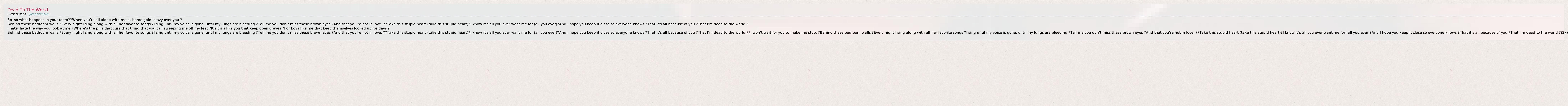 So, so what happens in your room??When you're all alone with me at home goin' crazy over you ? Behind these bedroom walls ?Every night I sing along with all her favorite songs ?I sing until my voice is gone, until my lungs are bleeding ?Tell me you don't miss these brown eyes ?And that you're not in love. ??Take this stupid heart (take this stupid heart)?I know it's all you ever want me for (all you ever)?And I hope you keep it close so everyone knows ?That it's all because of you ?That I'm dead to the world ? I hate, hate the way you look at me ?Where's the pills that cure that thing that you call sweeping me off my feet ?It's girls like you that keep open graves ?For boys like me that keep themselves locked up for days ? Behind these bedroom walls ?Every night I sing along with all her favorite songs ?I sing until my voice is gone, until my lungs are bleeding ?Tell me you don't miss these brown eyes ?And that you're not in love. ??Take this stupid heart (take this stupid heart)?I know it's all you ever want me for (all you ever)?And I hope you keep it close so everyone knows ?That it's all because of you ?That I'm dead to the world ??I won't wait for you to make me stop. ?Behind these bedroom walls ?Every night I sing along with all her favorite songs ?I sing until my voice is gone, until my lungs are bleeding ?Tell me you don't miss these brown eyes ?And that you're not in love. ??Take this stupid heart (take this stupid heart)?I know it's all you ever want me for (all you ever)?And I hope you keep it close so everyone knows ?That it's all because of you ?That I'm dead to the world ?(2x)
