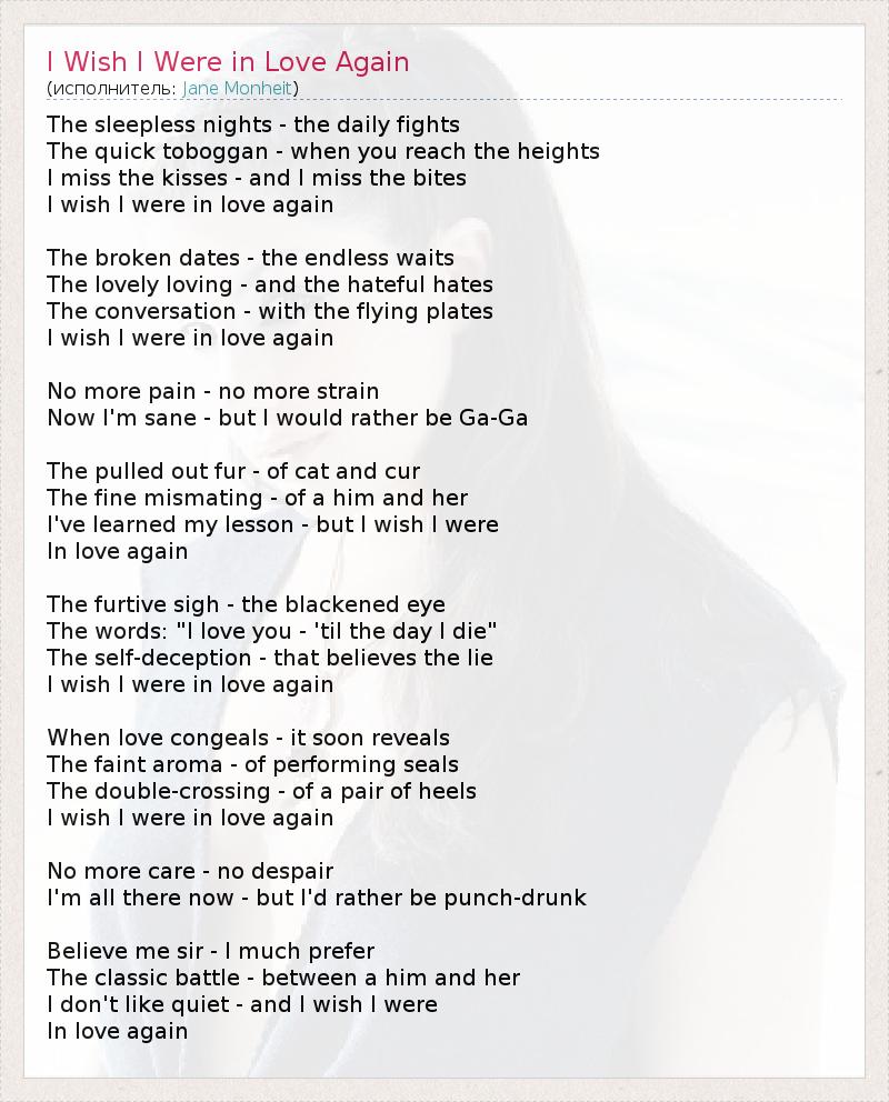 The sleepless nights - the daily fights The quick toboggan - when you reach the heights I miss the kisses - and I miss the bites I wish I were in love again The broken dates - the endless waits The lovely loving - and the hateful hates The conversation - with the flying plates I wish I were in love again No more pain - no more strain Now I'm sane - but I would rather be Ga-Ga The pulled out fur - of cat and cur The fine mismating - of a him and her I've learned my lesson - but I wish I were In love again The furtive sigh - the blackened eye The words: "I love you - 'til the day I die" The self-deception - that believes the lie I wish I were in love again When love congeals - it soon reveals The faint aroma - of performing seals The double-crossing - of a pair of heels I wish I were in love again No more care - no despair I'm all there now - but I'd rather be punch-drunk Believe me sir - I much prefer The classic battle - between a him and her I don't like quiet - and I wish I were In love again