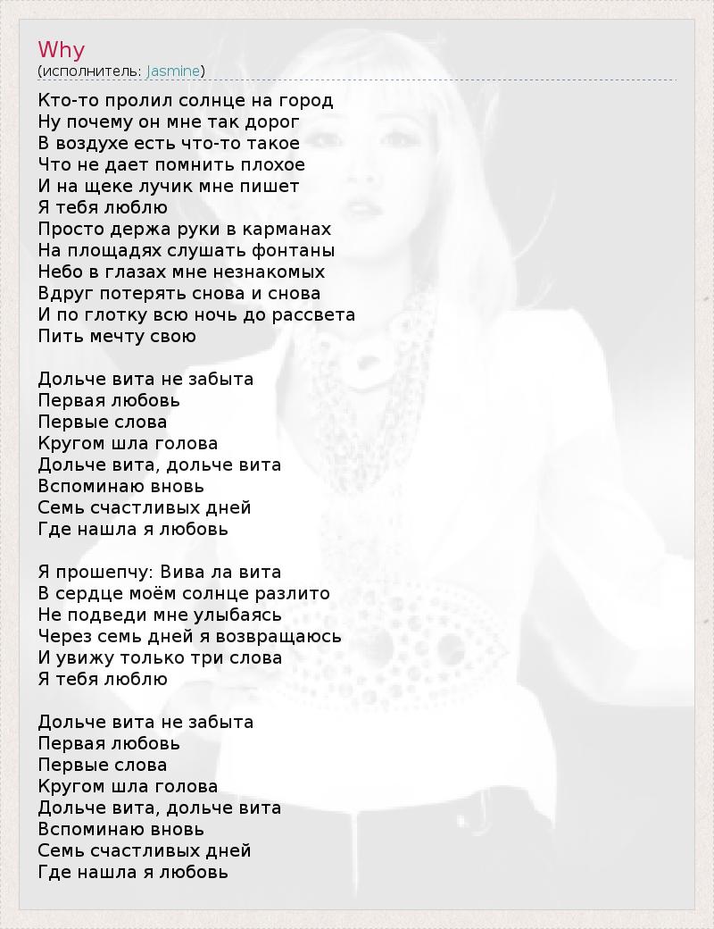 Кто-то пролил солнце на город Ну почему он мне так дорог В воздухе есть что-то такое Что не дает помнить плохое И на щеке лучик мне пишет Я тебя люблю Просто держа руки в карманах На площадях слушать фонтаны Небо в глазах мне незнакомых Вдруг потерять снова и снова И по глотку всю ночь до рассвета Пить мечту свою Дольче вита не забыта Первая любовь Первые слова Кругом шла голова Дольче вита, дольче вита Вспоминаю вновь Семь счастливых дней Где нашла я любовь Я прошепчу: Вива ла вита В сердце моём солнце разлито Не подведи мне улыбаясь Через семь дней я возвращаюсь И увижу только три слова Я тебя люблю Дольче вита не забыта Первая любовь Первые слова Кругом шла голова Дольче вита, дольче вита Вспоминаю вновь Семь счастливых дней Где нашла я любовь