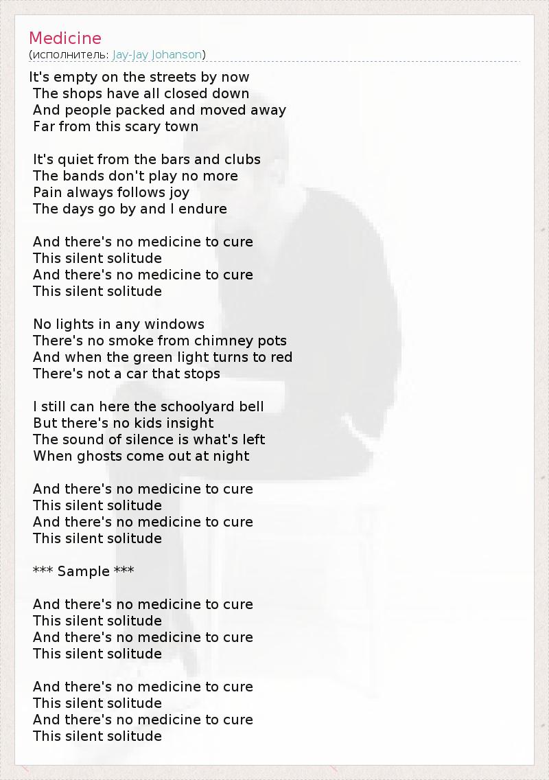 It's empty on the streets by now The shops have all closed down And people packed and moved away Far from this scary town It's quiet from the bars and clubs The bands don't play no more Pain always follows joy The days go by and I endure And there's no medicine to cure This silent solitude And there's no medicine to cure This silent solitude No lights in any windows There's no smoke from chimney pots And when the green light turns to red There's not a car that stops I still can here the schoolyard bell But there's no kids insight The sound of silence is what's left When ghosts come out at night And there's no medicine to cure This silent solitude And there's no medicine to cure This silent solitude *** Sample *** And there's no medicine to cure This silent solitude And there's no medicine to cure This silent solitude And there's no medicine to cure This silent solitude And there's no medicine to cure This silent solitude